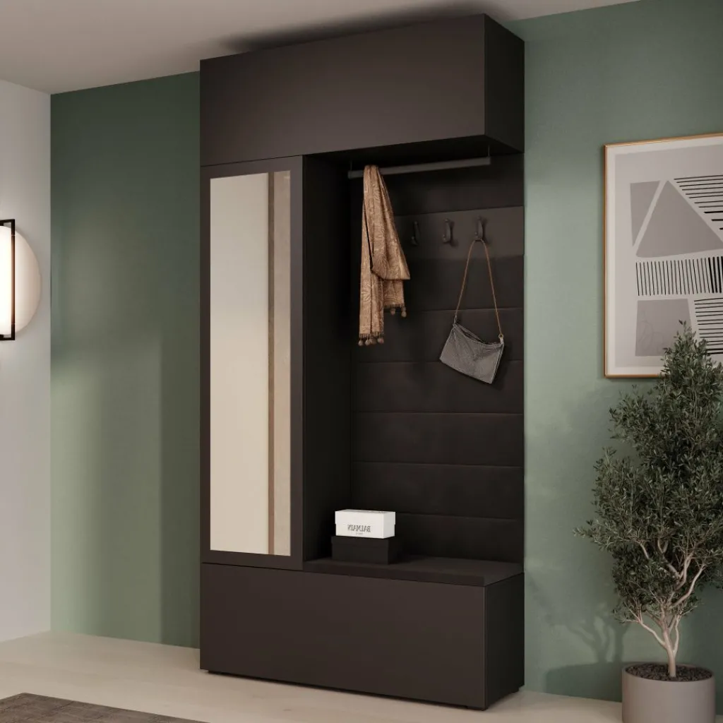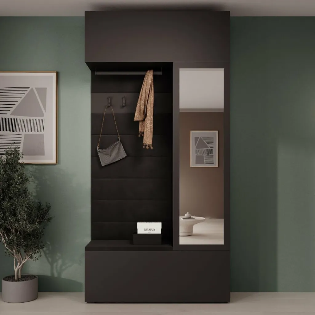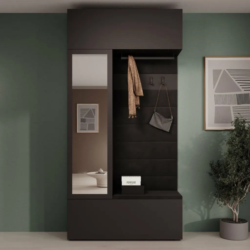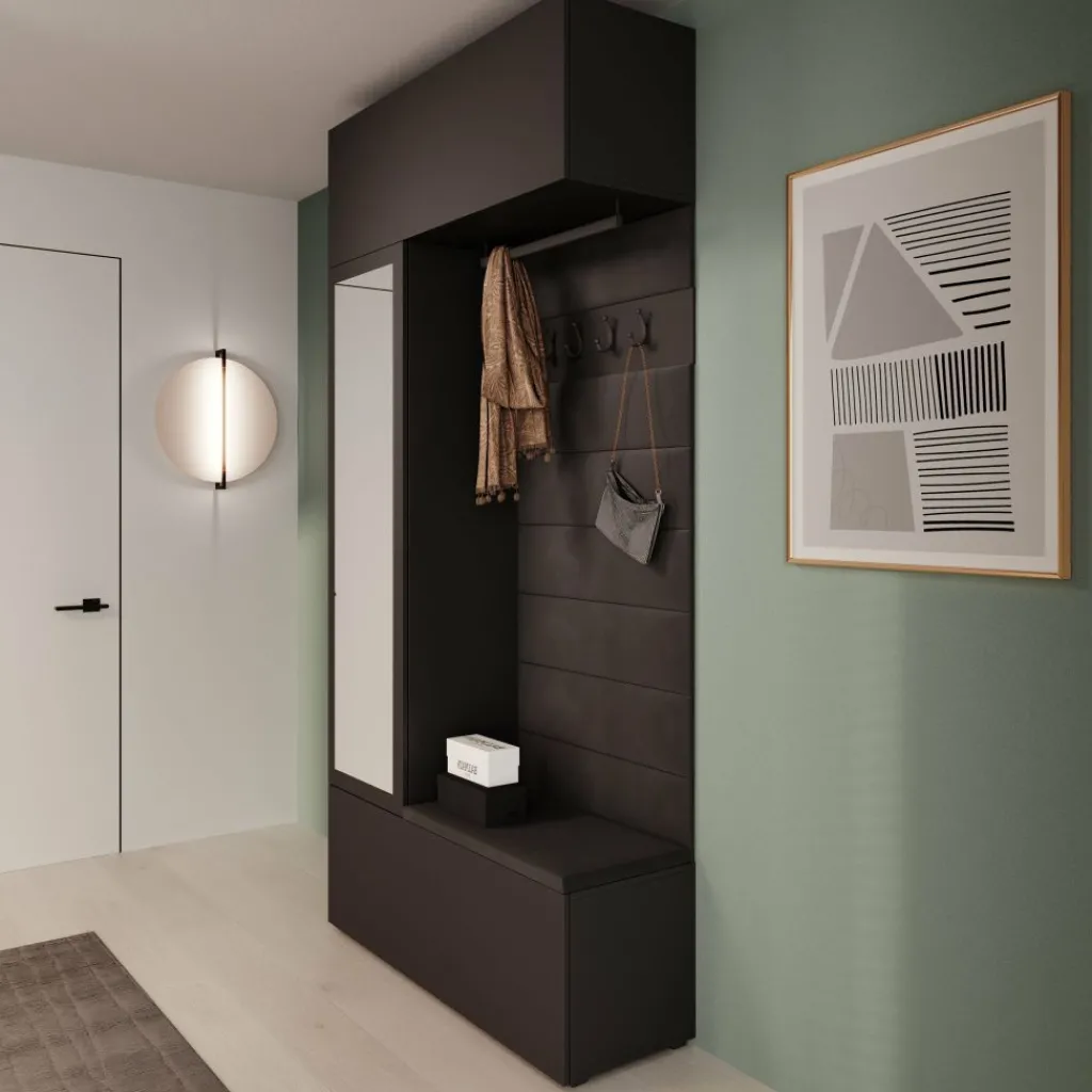 De Telora halkast is flexibel in gebruik en kan zowel links- als rechts opgebouwd worden, zodat je het meubel eenvoudig aanpast aan de indeling van jouw ruimte. De zwarte afwerking geeft het meubel een krachtige en moderne uitstraling en laat zich goed combineren met uiteenlopende interieurstijlen.