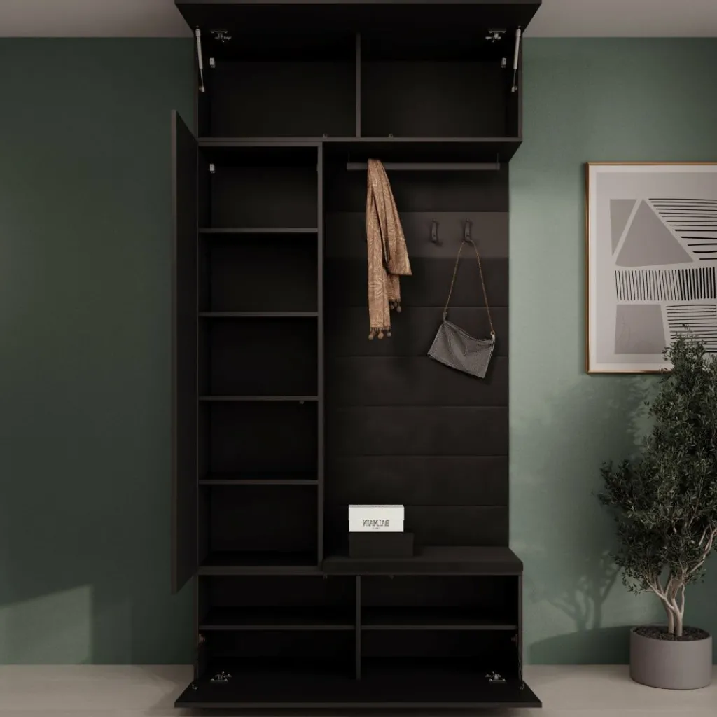 Achter de deur bevinden zich meerdere legplanken die geschikt zijn voor schoenen, tassen of andere accessoires. Elke legplank achter de deur heeft een maximaal draagvermogen van 5 kg. Onderaan het meubel zijn extra opbergvakken aanwezig, eveneens met een maximaal draagvermogen van 5 kg per vak. Bovenin, achter de klep, is ruimte voor grotere of minder vaak gebruikte items; dit bovenste vak heeft een maximaal draagvermogen van 20 kg.