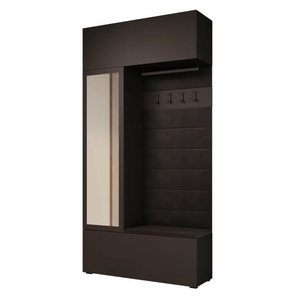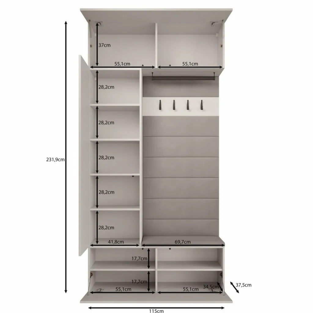 Het open middengedeelte is voorzien van een zitgedeelte en een achterwand met haken en een roede, handig voor jassen, sjaals en tassen. De combinatie van gesloten en open opbergruimte zorgt voor overzicht en een opgeruimde hal.