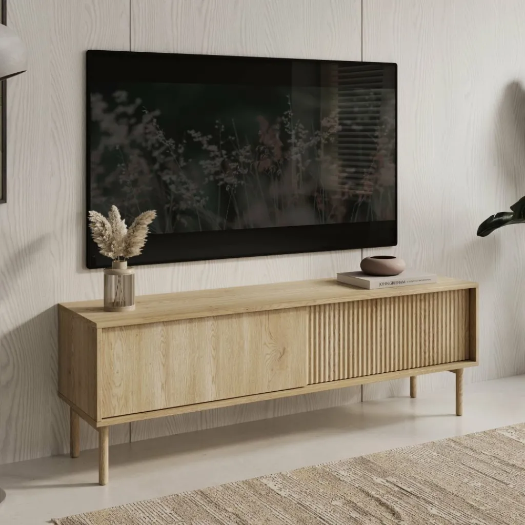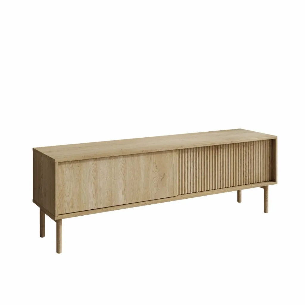 Het Tenerife tv-meubel van Meubella is uitgevoerd in eikenlook en heeft een afmeting van 154 x 40 x 55 centimeter. Het meubel heeft een moderne vormgeving met een combinatie van gladde en verticaal gefreesde fronten. De hoge poten zorgen voor een open uitstraling en maken het eenvoudig om onder het meubel schoon te houden.