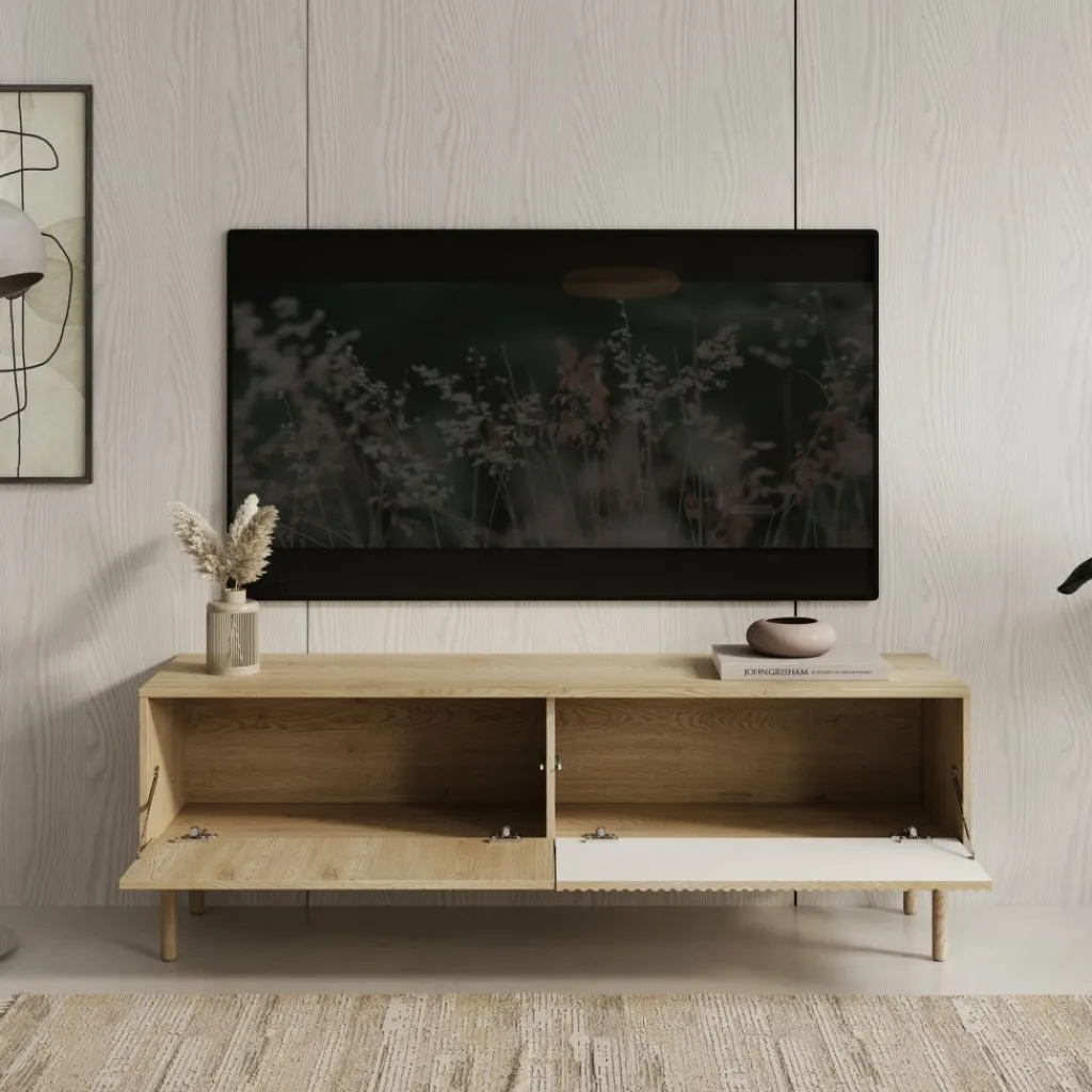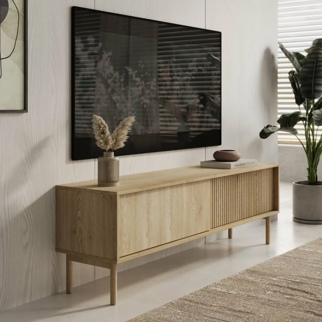 Het tv-meubel biedt voldoende ruimte voor audiovisuele apparatuur en accessoires. De gesloten opbergruimte zorgt ervoor dat kabels en apparatuur netjes uit het zicht blijven. Dankzij het tijdloze ontwerp past het Tenerife tv-meubel goed in verschillende interieurstijlen en is het geschikt voor diverse woonruimtes.