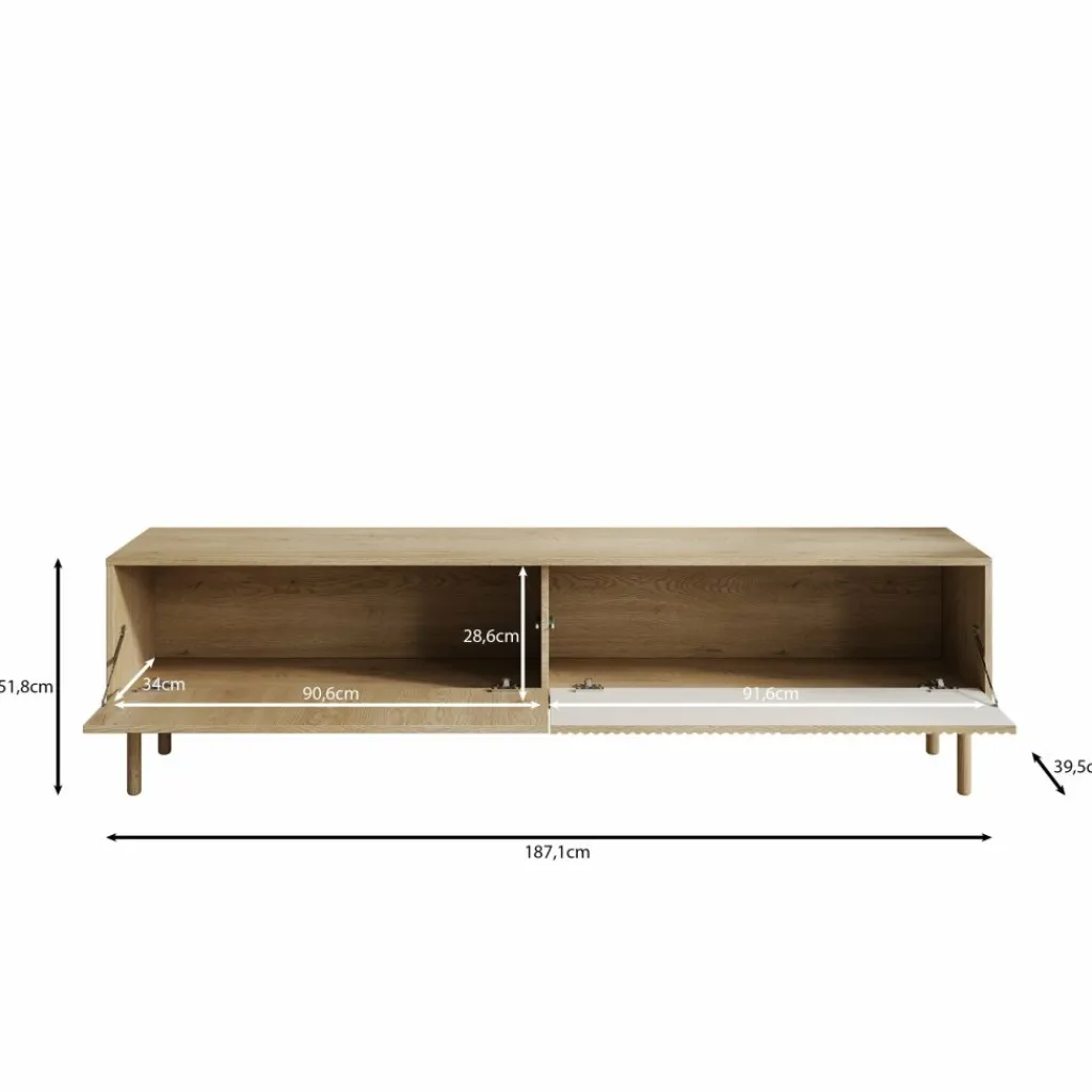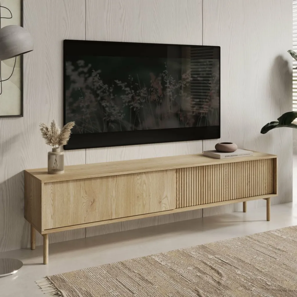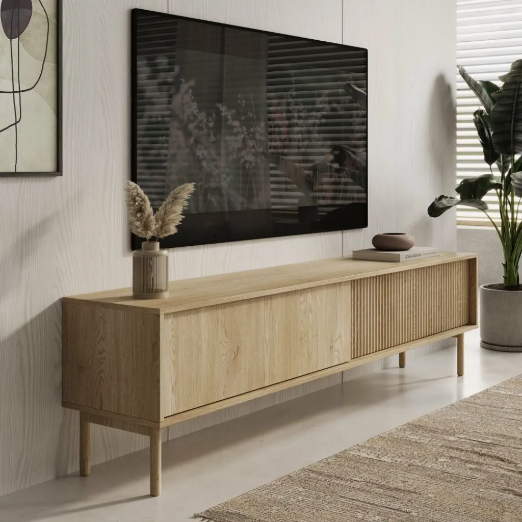 Het meubel biedt voldoende ruimte voor televisies en audiovisuele apparatuur. De opbergruimte achter de schuifdeuren maakt het mogelijk om kabels, afstandsbedieningen en andere accessoires netjes uit het zicht op te bergen. Dankzij het neutrale ontwerp past het Tenerife tv-meubel in uiteenlopende interieurstijlen en kan het in verschillende woonruimtes worden geplaatst.