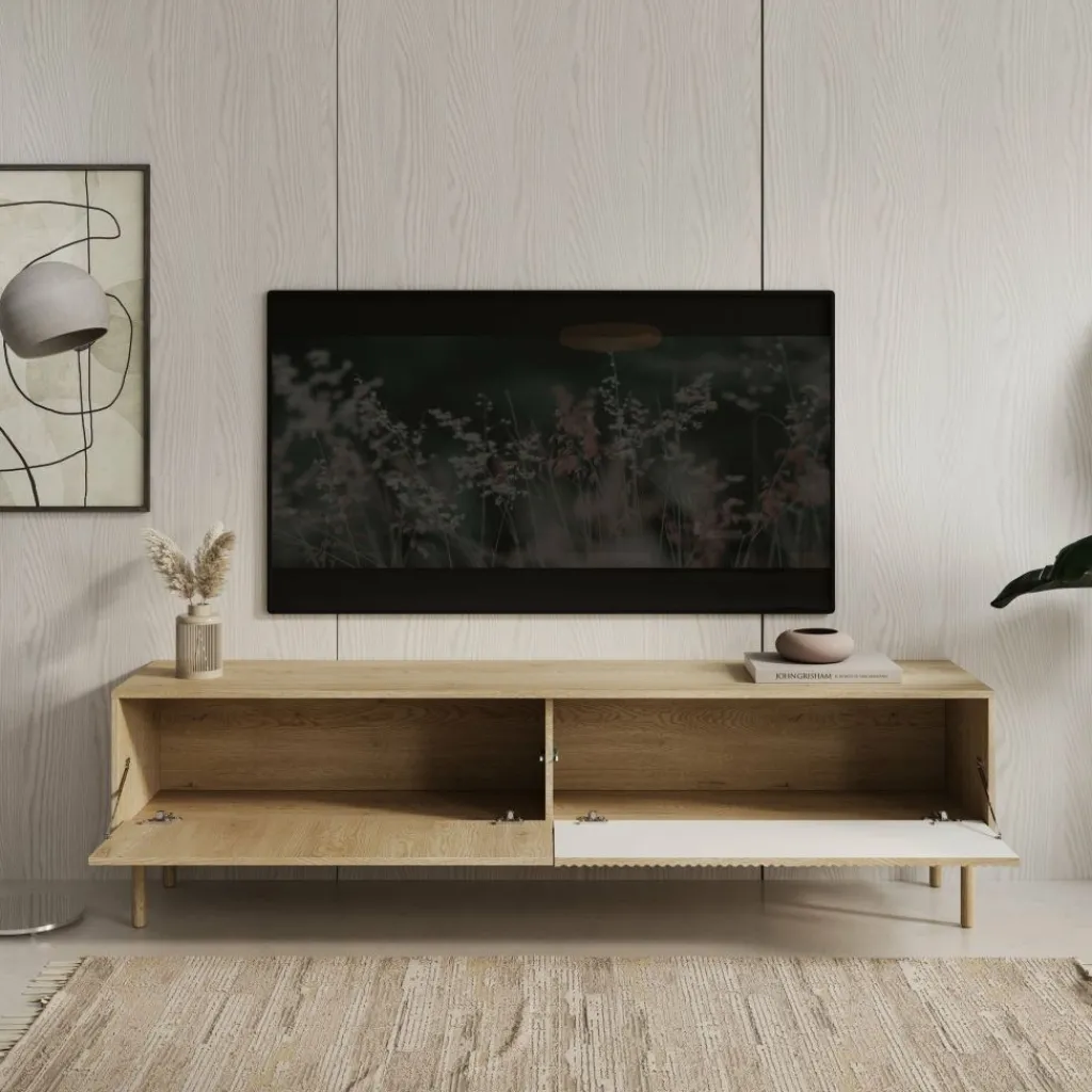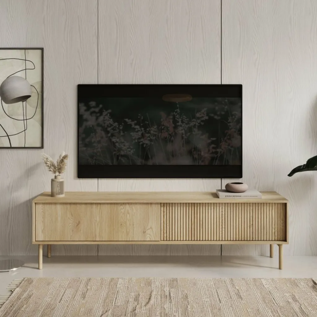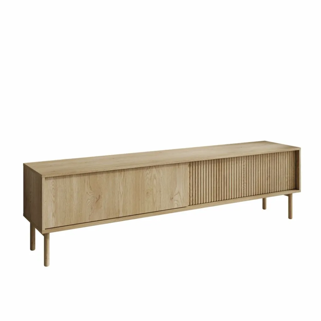 Het meubel biedt voldoende ruimte voor televisies en audiovisuele apparatuur. De opbergruimte achter de schuifdeuren maakt het mogelijk om kabels, afstandsbedieningen en andere accessoires netjes uit het zicht op te bergen. Dankzij het neutrale ontwerp past het Tenerife tv-meubel in uiteenlopende interieurstijlen en kan het in verschillende woonruimtes worden geplaatst.