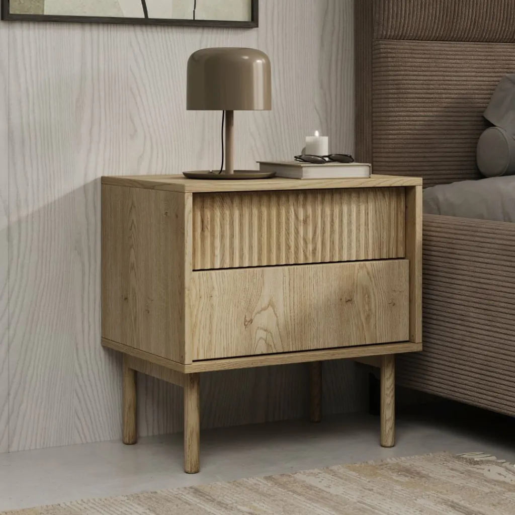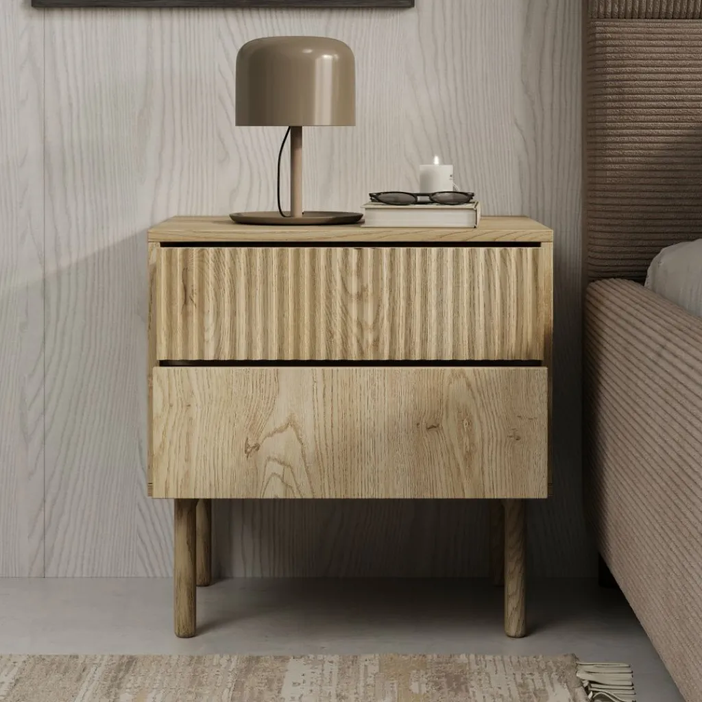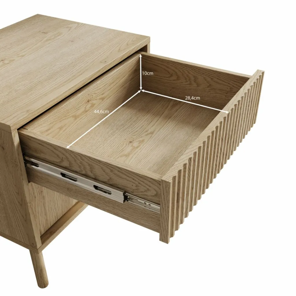 Het nachtkastje Tenerife heeft een eikenlook afwerking en een strak, rechtlijnig ontwerp. De bovenste lade is voorzien van een verticale latstructuur die zorgt voor een rustig en evenwichtig geheel.