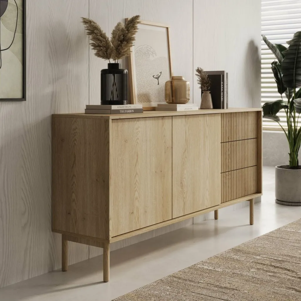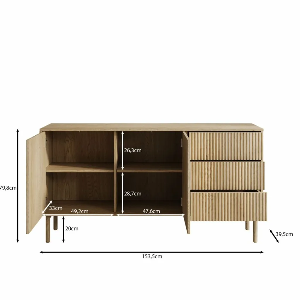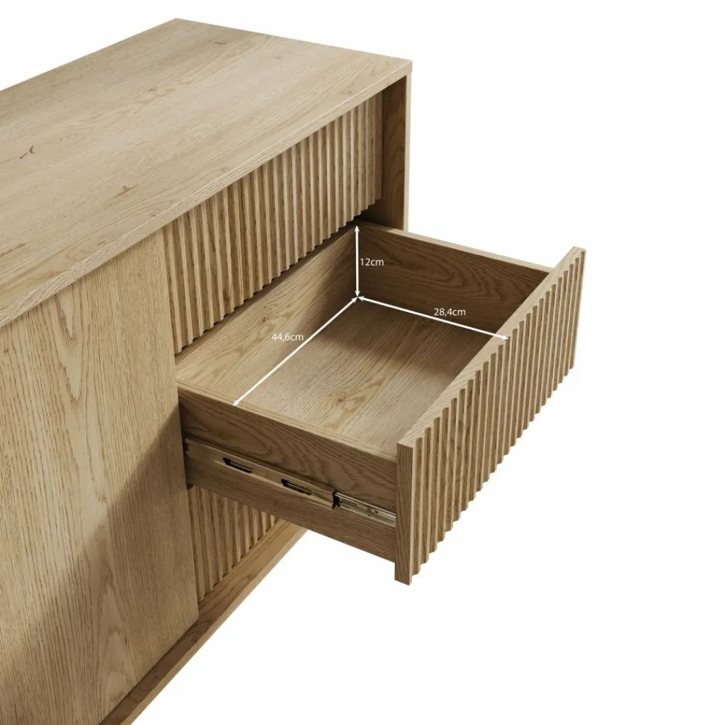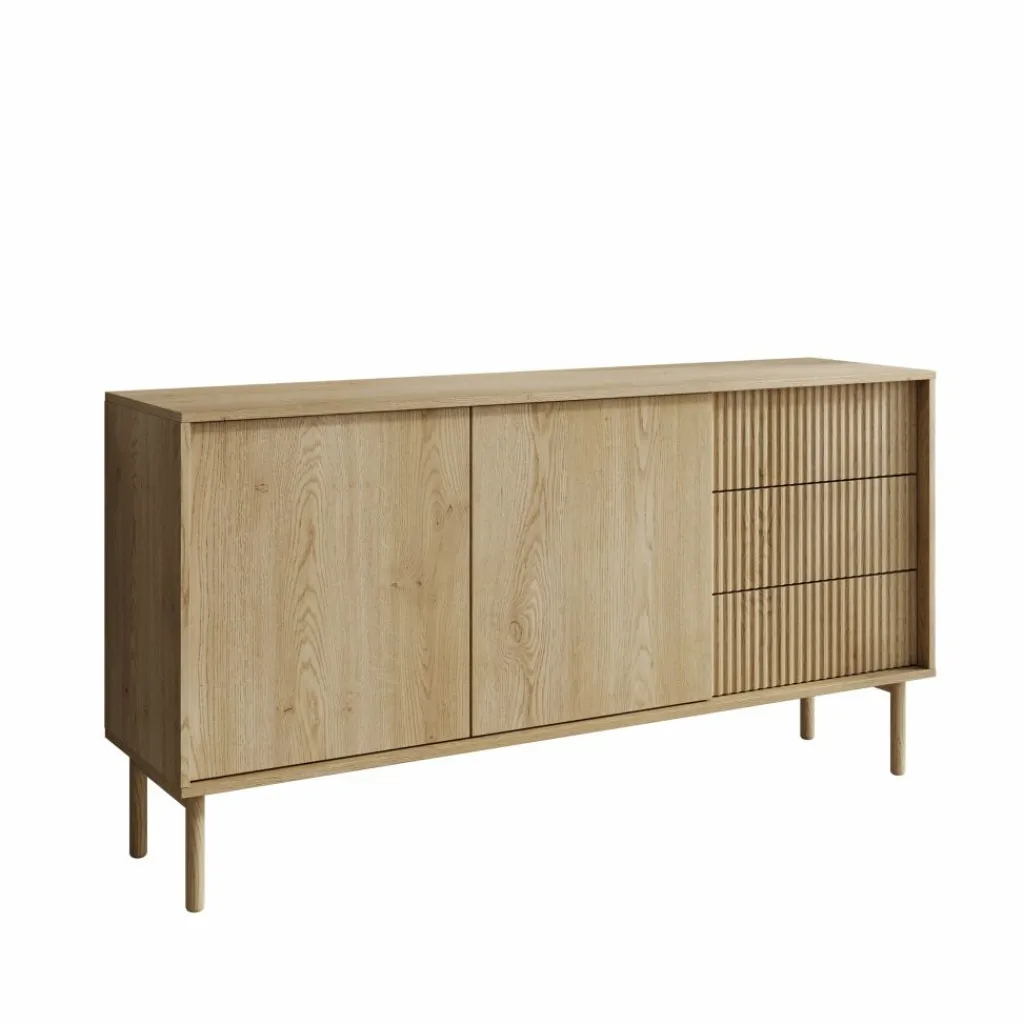 Het dressoir Tenerife heeft een eiken afwerking met een combinatie van gladde en verticaal gelijnde fronten. De kast beschikt over twee deuren en drie lades, die samen praktische opbergruimte bieden voor verschillende spullen.