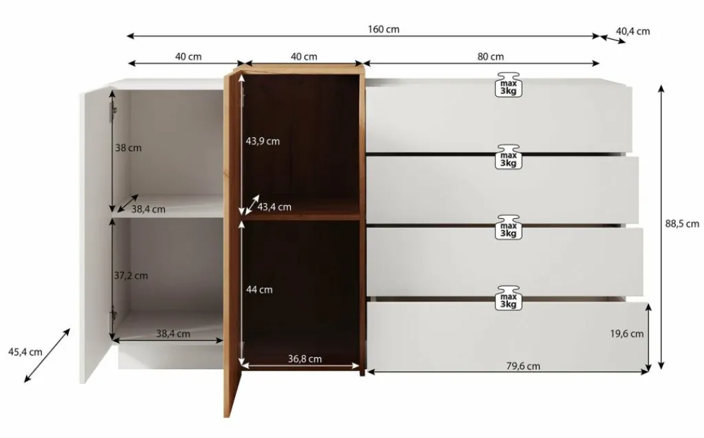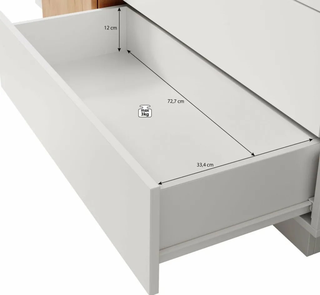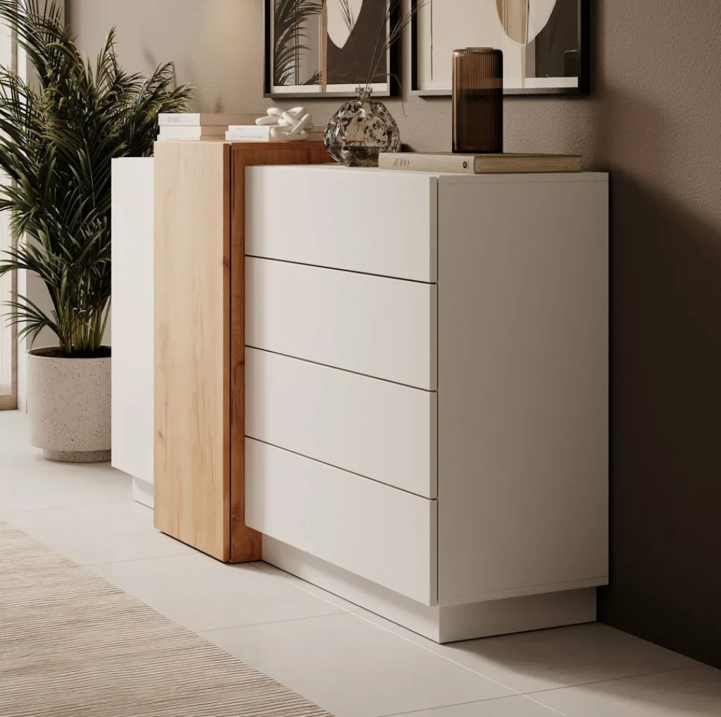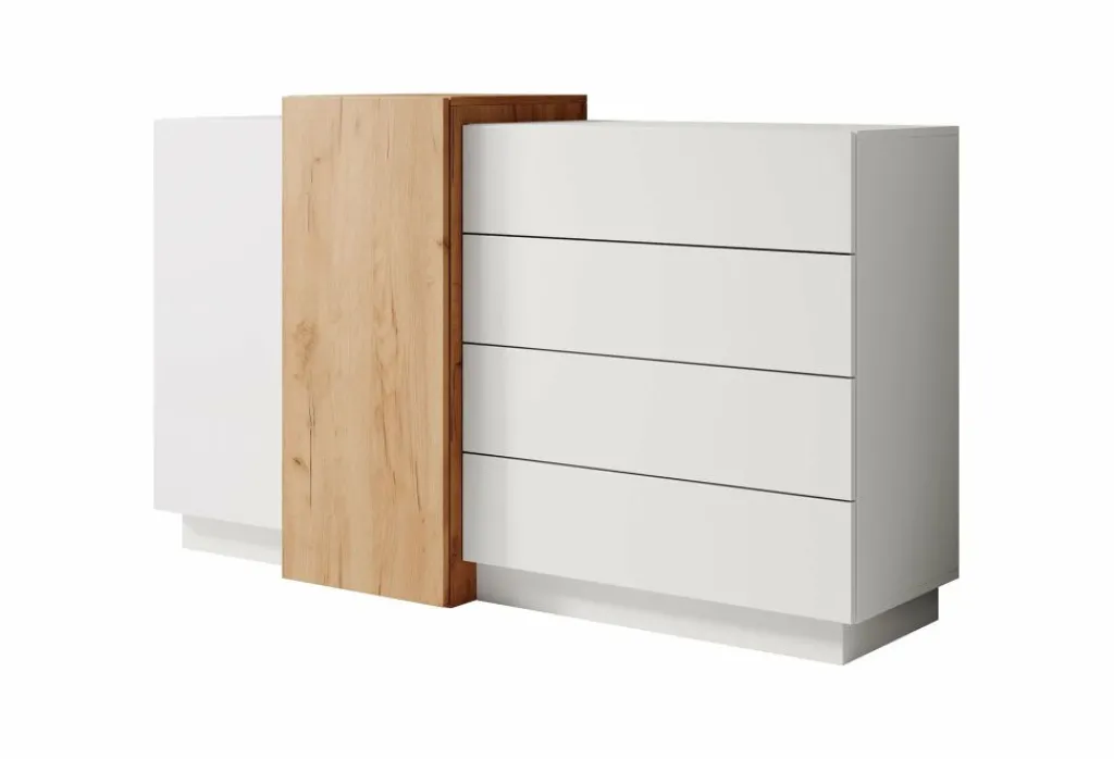 Commode Three is een moderne kast uitgevoerd in een witte en eiken kleur. Het dressoir beschikt over 4 lades en 2 klepdeuren. Deze zijn te openen middels een push to open systeem.