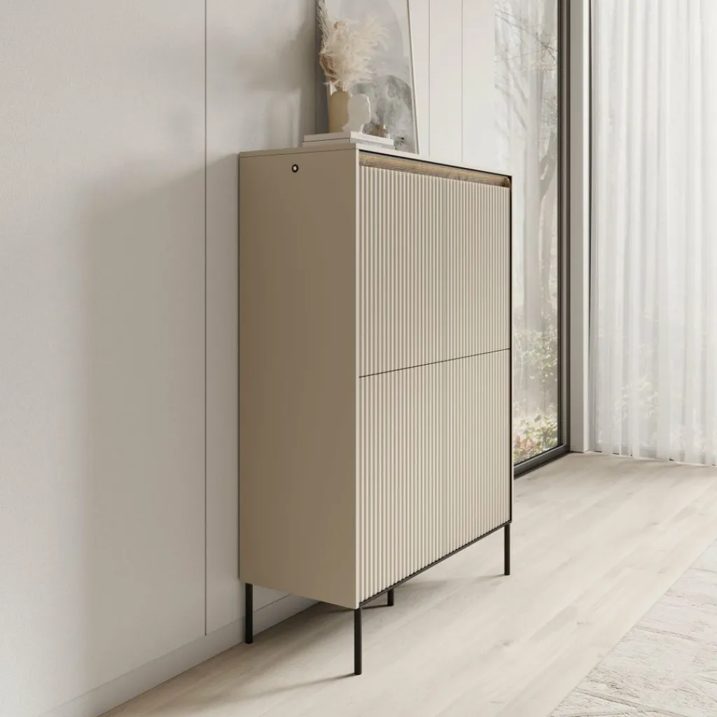 De kast heeft 4 deuren. De deuren zijn greeploos en openen via een push-to-open systeem. Achter de deuren zitten 8 opbergvakken. Het dressoir beschikt over LED-verlichting.