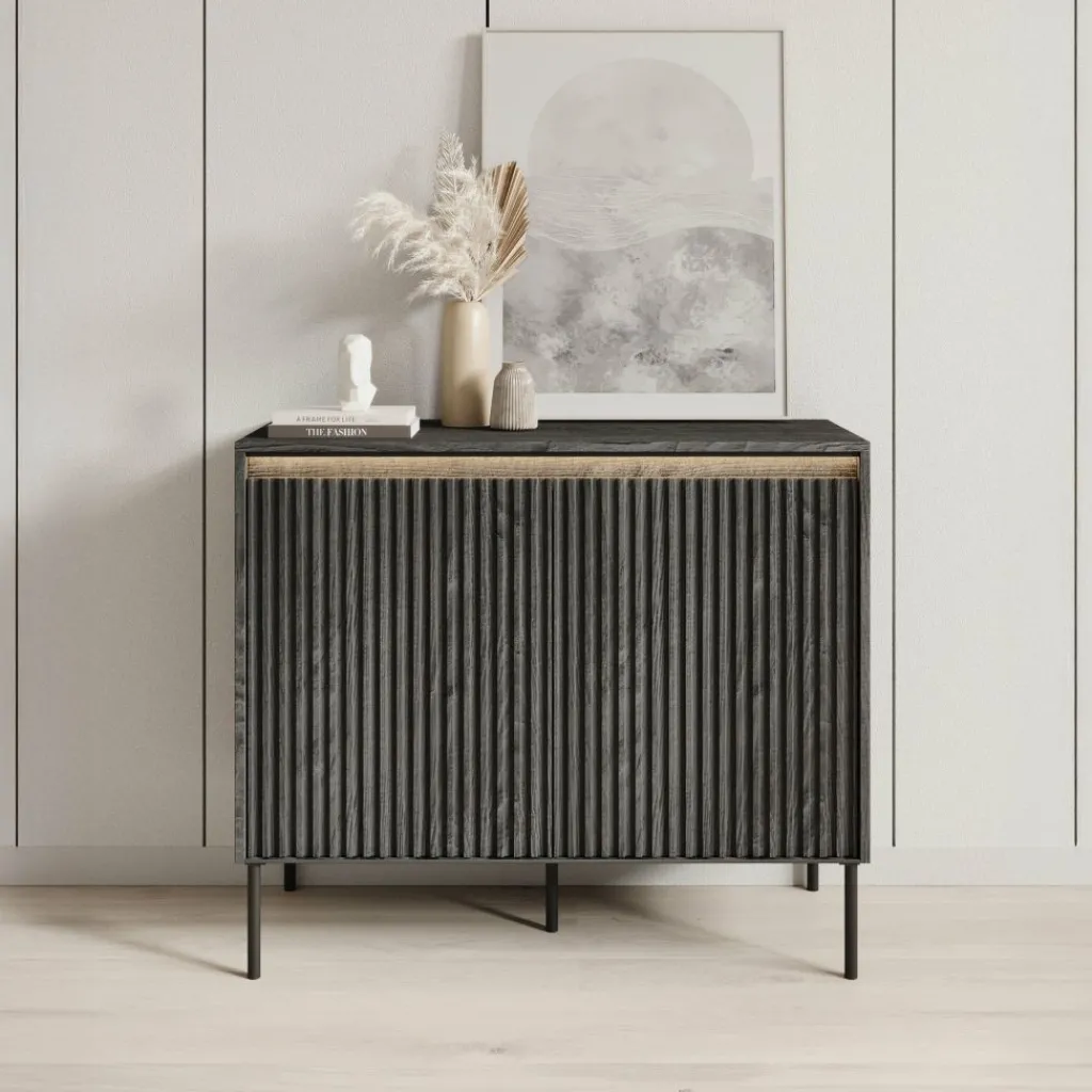 De kast heeft 2 greeploze deuren die eenvoudig via de bovenzijde geopend kunnen worden. Achter de deuren bevinden zich 4 opbergvakken, ideaal voor het overzichtelijk opbergen van je spullen. De deurfronten zijn afgewerkt met een stijlvol lattenpatroon dat het meubel een eigentijdse uitstraling geeft.