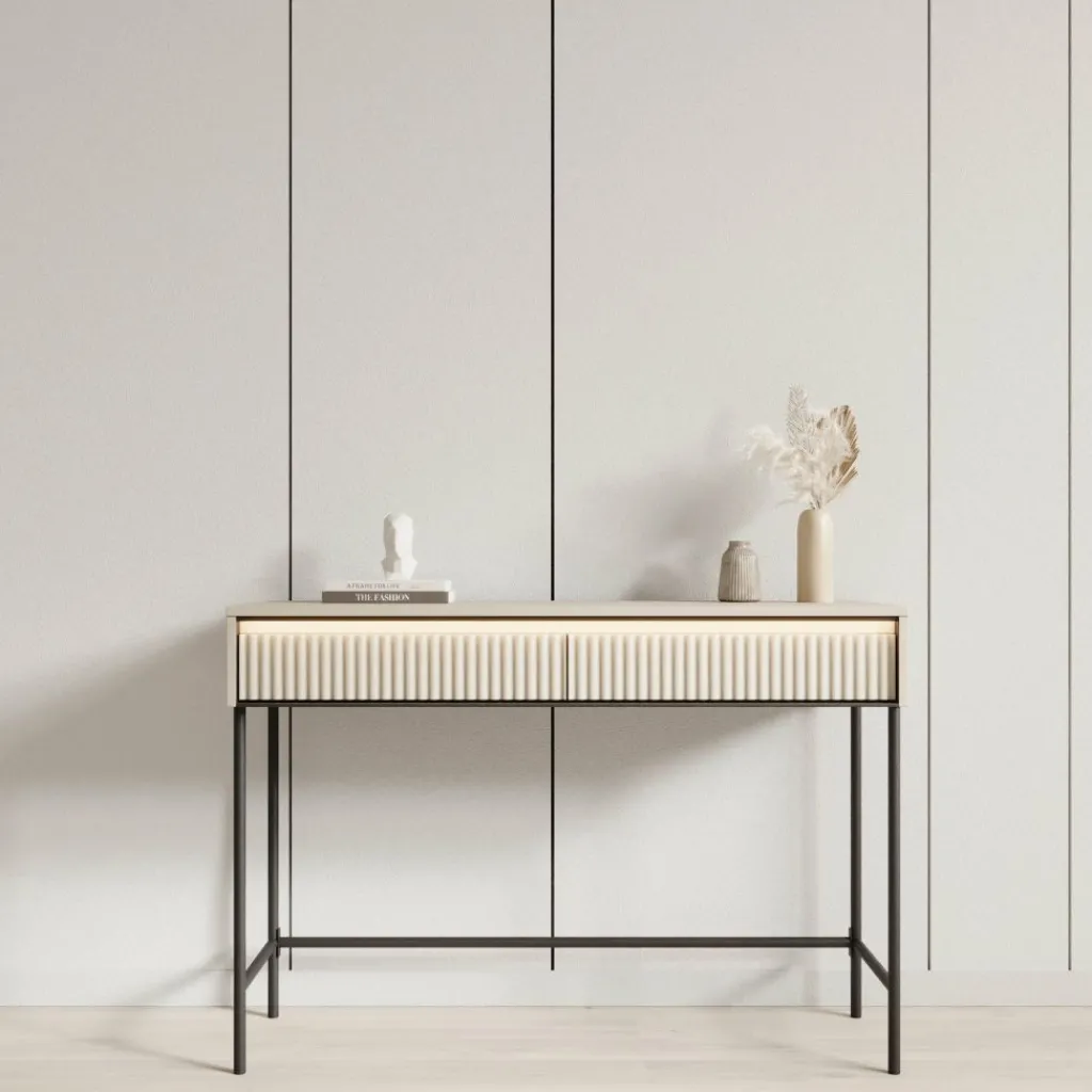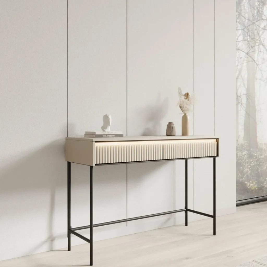 De kaptafel Timoteo is een moderne blikvanger in hotel chique stijl. Het meubel is uitgevoerd in een warme beige kleur en beschikt over twee ruime, greeploze lades. De ladefronten zijn voorzien van een stijlvol lattenpatroon, wat zorgt voor een luxe en subtiel speels accent. Boven de lades bevindt zich een geïntegreerde LED-strip, die zorgt voor een zachte, sfeervolle verlichting tijdens het opmaken of stylen.