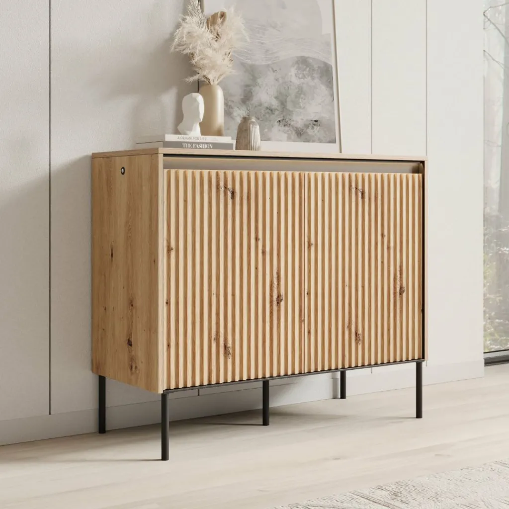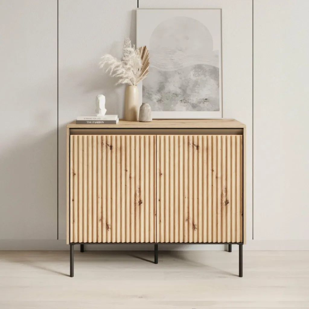 De kast heeft 2 greeploze deuren die eenvoudig via de bovenzijde geopend kunnen worden. Achter de deuren bevinden zich 4 opbergvakken, ideaal voor het overzichtelijk opbergen van je spullen. De deurfronten zijn voorzien van een stijlvol lattenpatroon dat het meubel een eigentijdse uitstraling geeft.