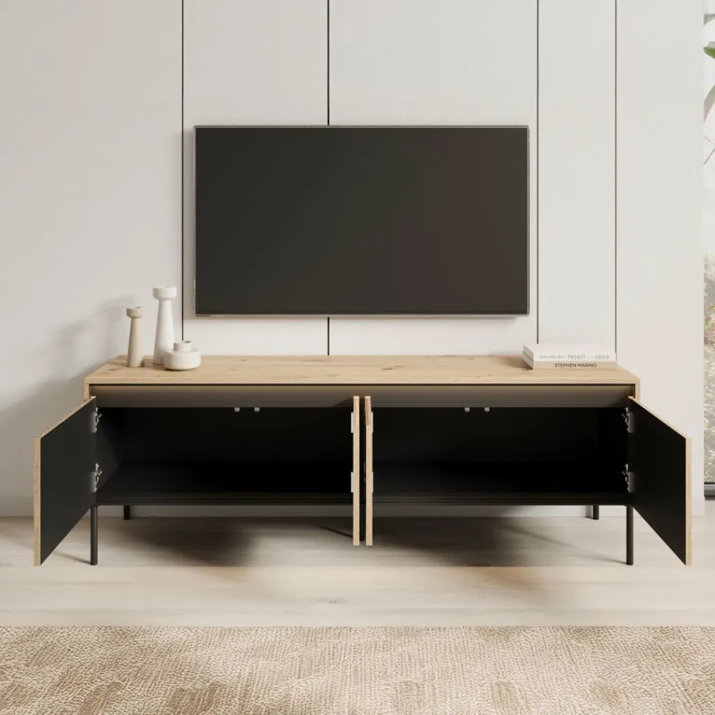 De kast beschikt over 4 greeploze deuren die geopend worden via de bovenzijde. Achter de deuren bevinden zich 2 opbergvakken, ideaal om apparatuur, kabels of andere spullen netjes in op te bergen. De deurfronten zijn voorzien van een stijlvol lattenpatroon, wat het meubel een eigentijdse uitstraling geeft.