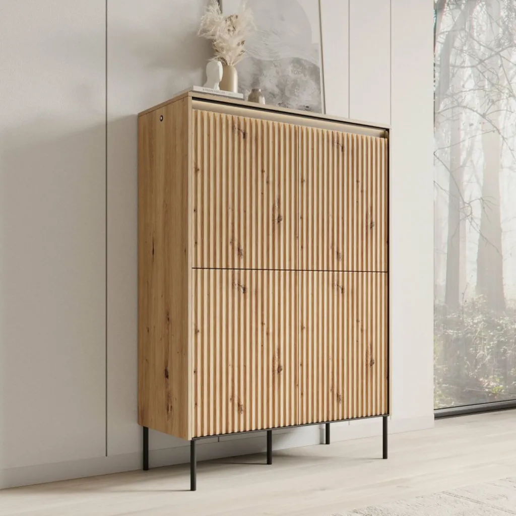 De kast heeft 4 deuren. De deuren zijn greeploos en openen via een push-to-open systeem. Achter de deuren zitten 8 opbergvakken. Het dressoir beschikt over LED-verlichting.