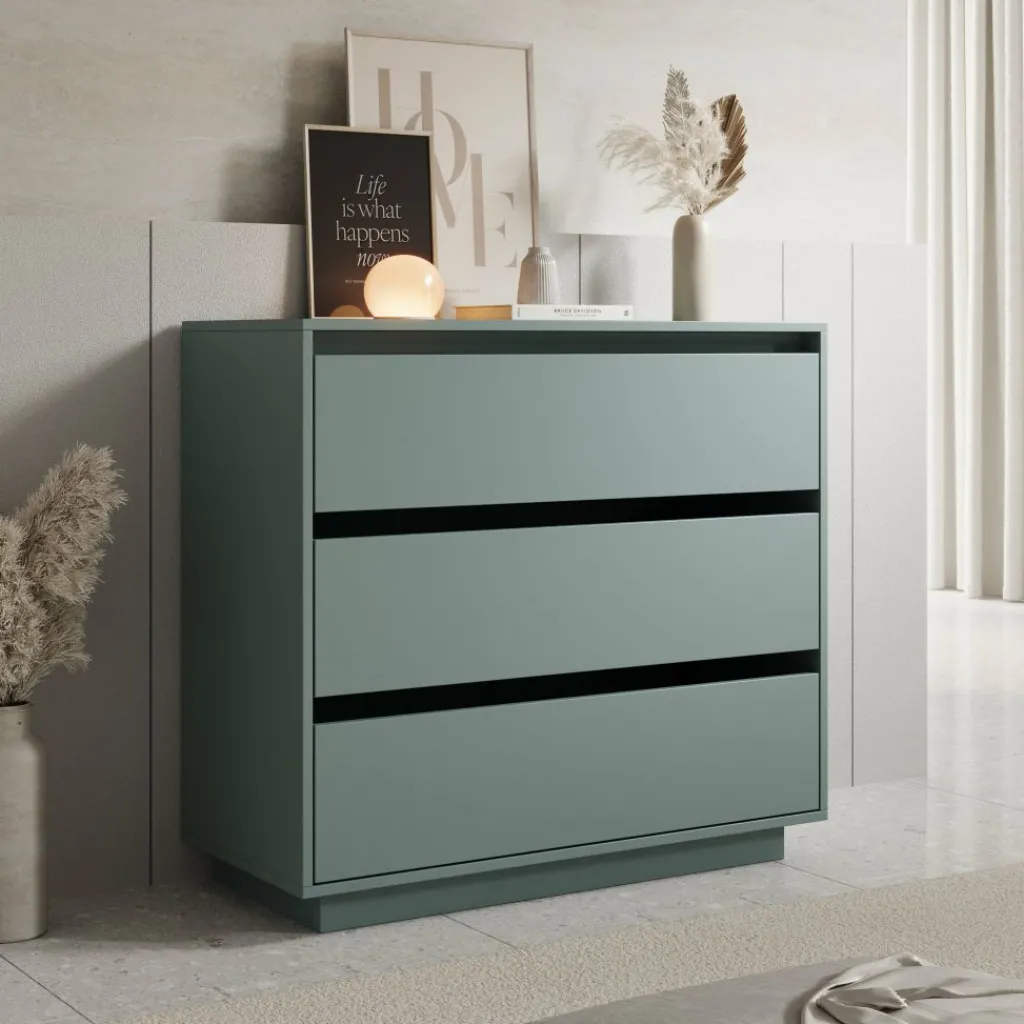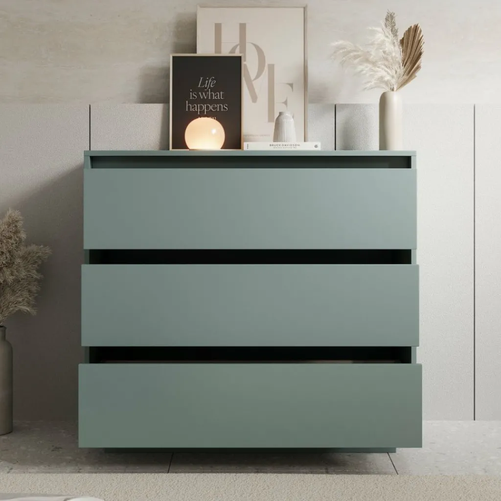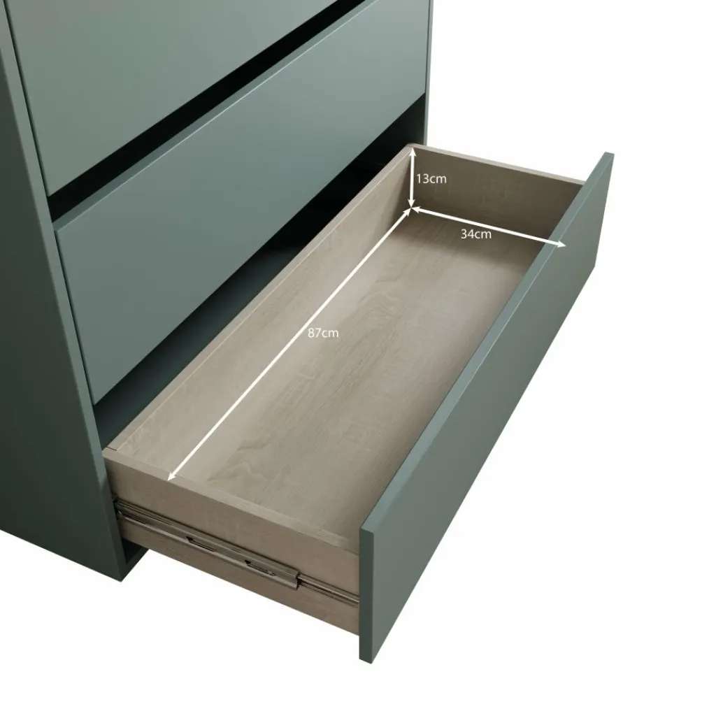 Het Tivaro ladekast in groen is een staande ladekast met een strak en rechthoekig ontwerp. Met de afmetingen van 94x87x41 cm is dit meubel geschikt voor gebruik in de slaapkamer of een andere ruimte waar extra opbergruimte nodig is.