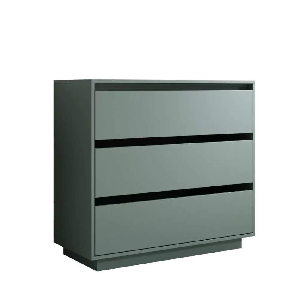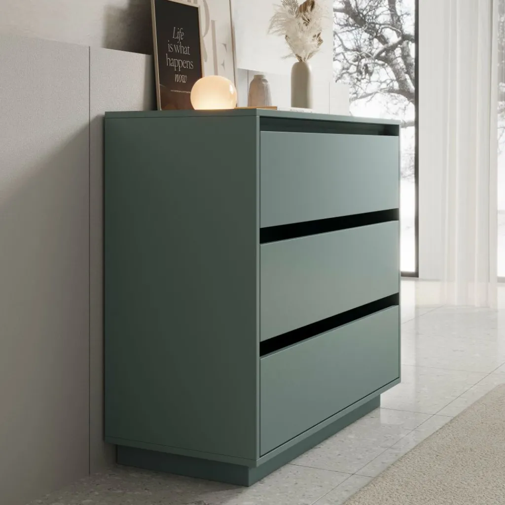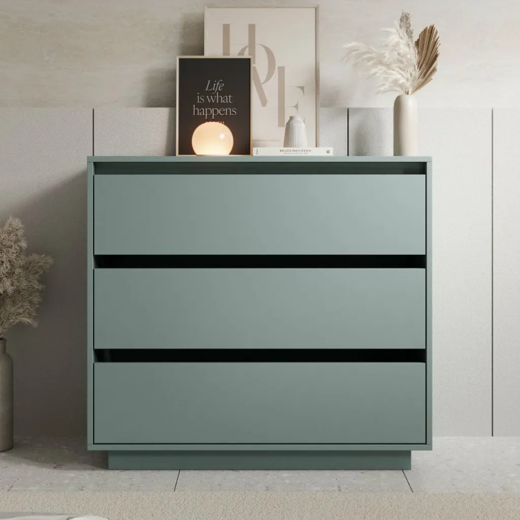 Het Tivaro ladekast in groen is een staande ladekast met een strak en rechthoekig ontwerp. Met de afmetingen van 94x87x41 cm is dit meubel geschikt voor gebruik in de slaapkamer of een andere ruimte waar extra opbergruimte nodig is.