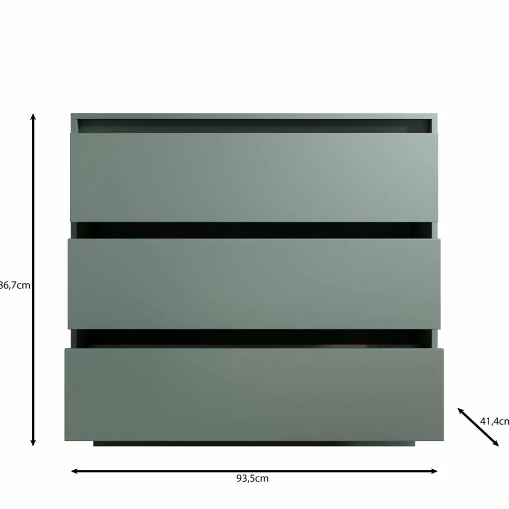 De ladekast is uitgevoerd met drie lades voor het opbergen van kleding, accessoires of andere spullen. Tussen de lades zijn open tussenruimtes zichtbaar. Het bovenblad kan worden gebruikt voor het plaatsen van decoratieve items zoals lijsten, een lamp of andere accessoires. Het meubel staat op een lage plint en is vrijstaand geplaatst.