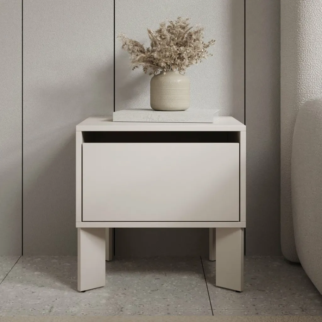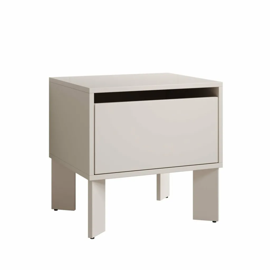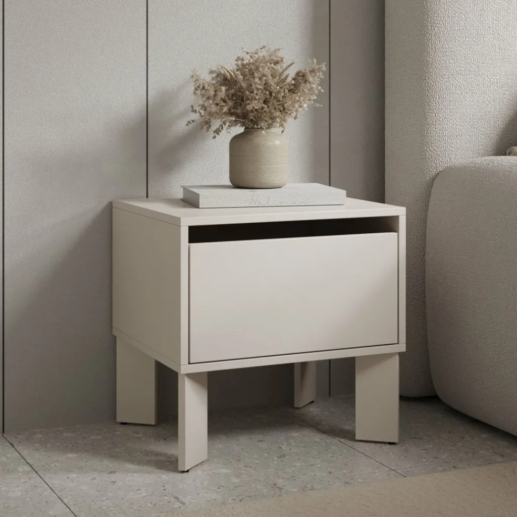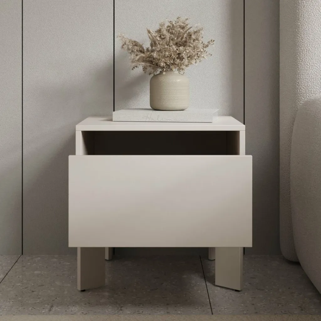 Het Tivaro nachtkastje is een compact nachtkastje in beige met een strak en rechthoekig ontwerp. Met de afmetingen van 48x41x48 cm past het gemakkelijk naast het bed en biedt het praktische opbergruimte zonder veel vloeroppervlak in te nemen.