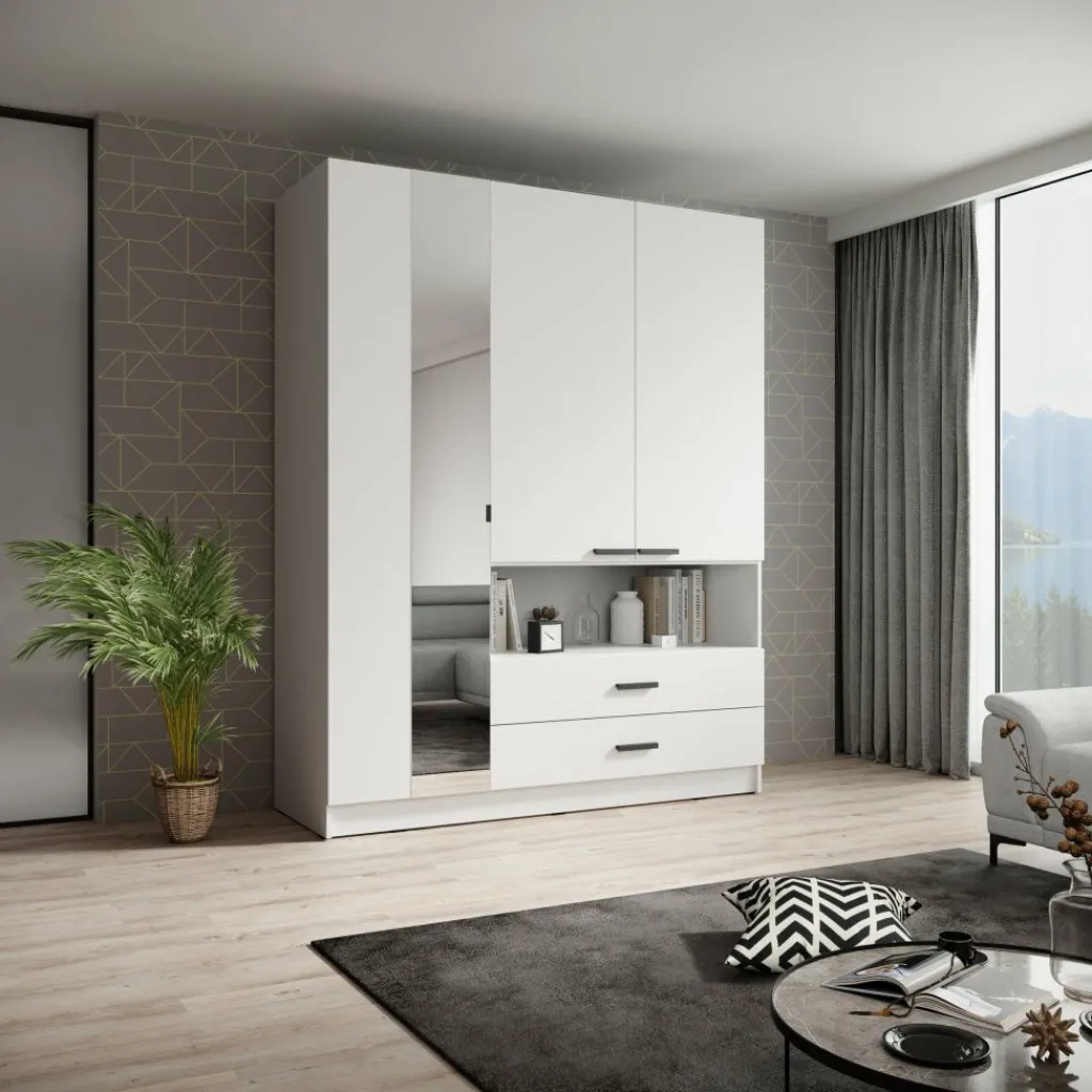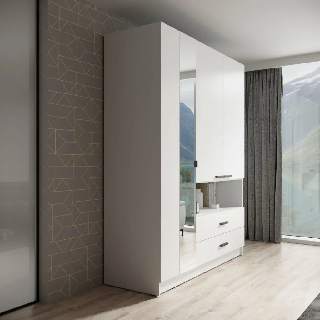 De kledingkast Tobin combineert een strak design met praktische opbergruimte. De kast is uitgevoerd in een frisse witte kleur en voorzien van drie deuren, waarvan één met spiegel. Hierdoor oogt je slaapkamer niet alleen ruimtelijker, maar heb je ook altijd een handige spiegel bij de hand.