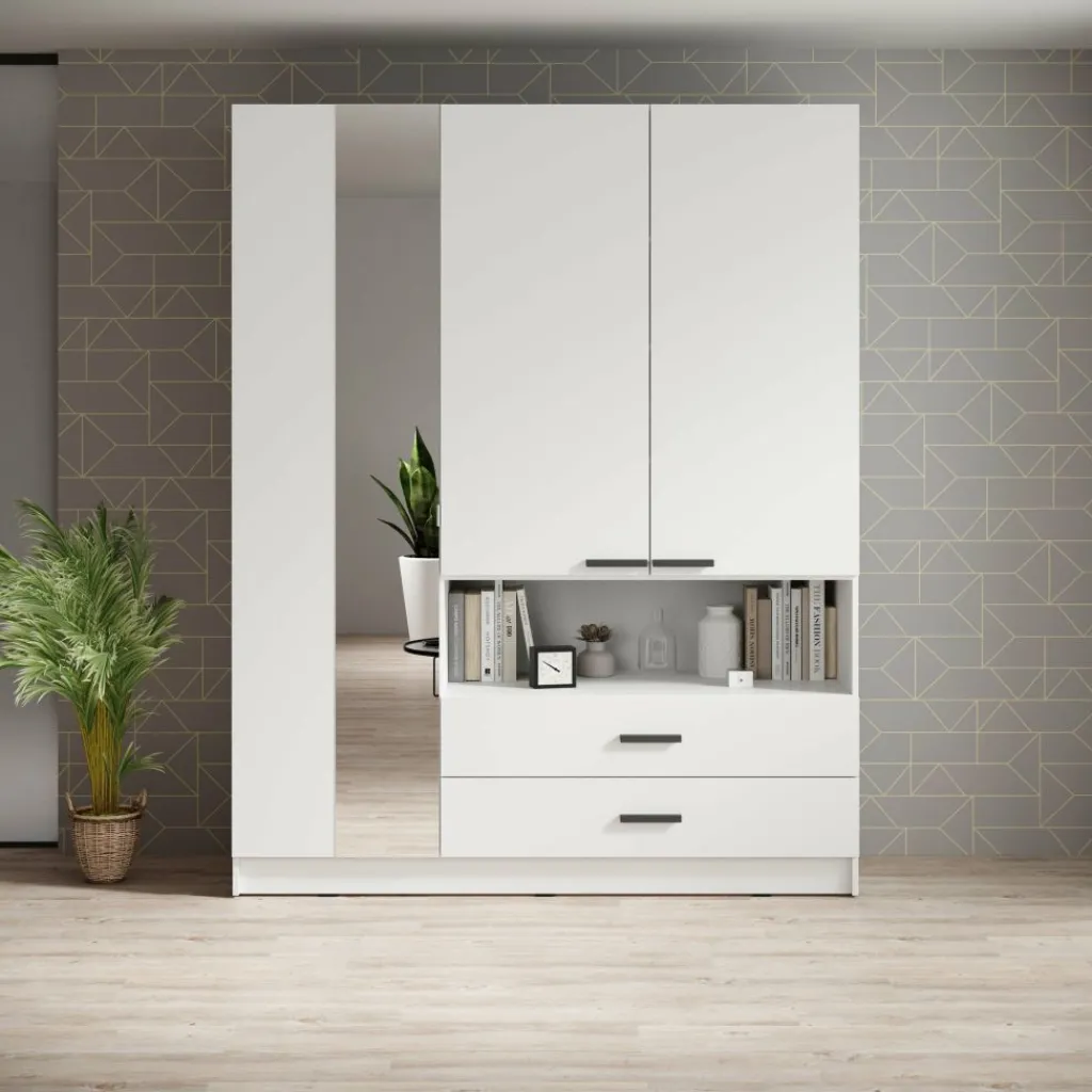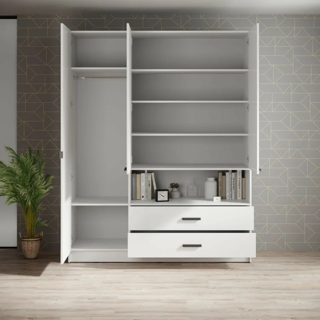 De kast is ingedeeld met een combinatie van legplanken, een hanggedeelte en twee ruime lades, waardoor je moeiteloos al je kleding en accessoires overzichtelijk kunt opbergen. Het open vak in het midden geeft de kast een moderne uitstraling en biedt extra ruimte voor decoratie of boeken.