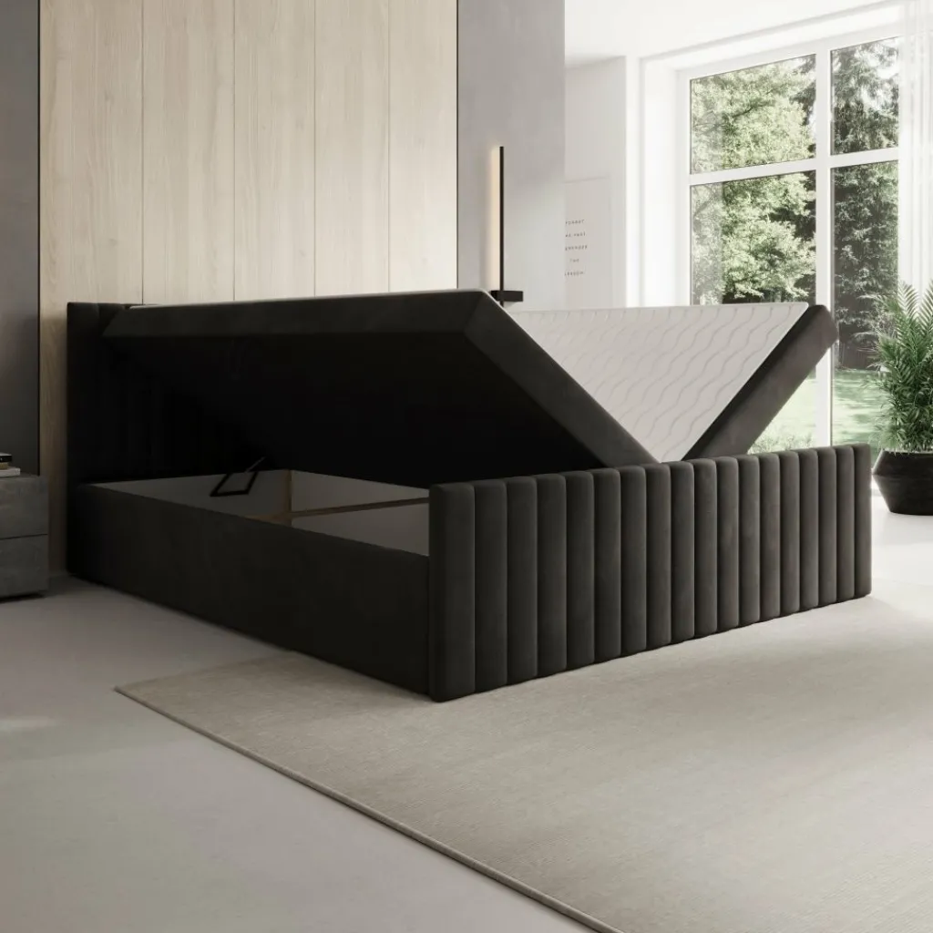 Het bed is voorzien van twee opbergvakken aan weerszijden van het bed en biedt daarmee een praktische opbergoplossing voor beddengoed of seizoensartikelen. Een veermechanisme maakt het openen licht en comfortabel, zodat je eenvoudig toegang krijgt tot de ruimte onder het matras. Het hoofdmatras biedt stabiele lichaamsondersteuning en langdurige vormvastheid, waarbij de H3-hardheid geschikt is voor wie graag op een stevige basis slaapt. Daarboven ligt een topper die het ligoppervlak egaliseert en het geheel compleet maakt.