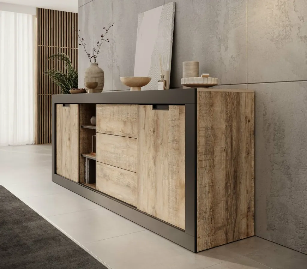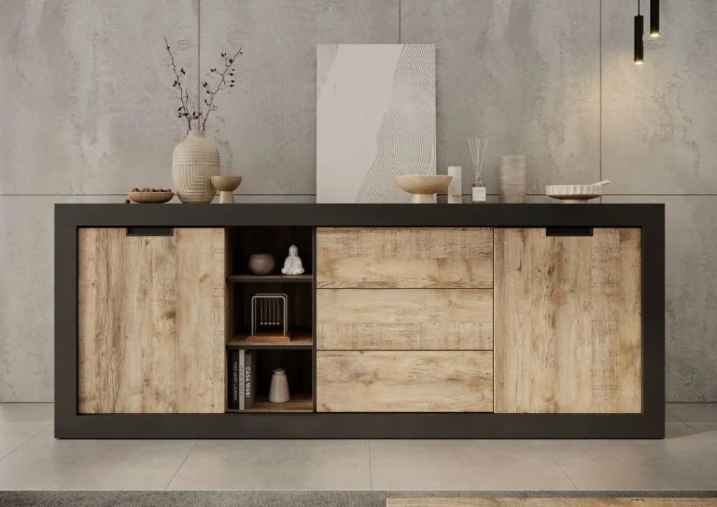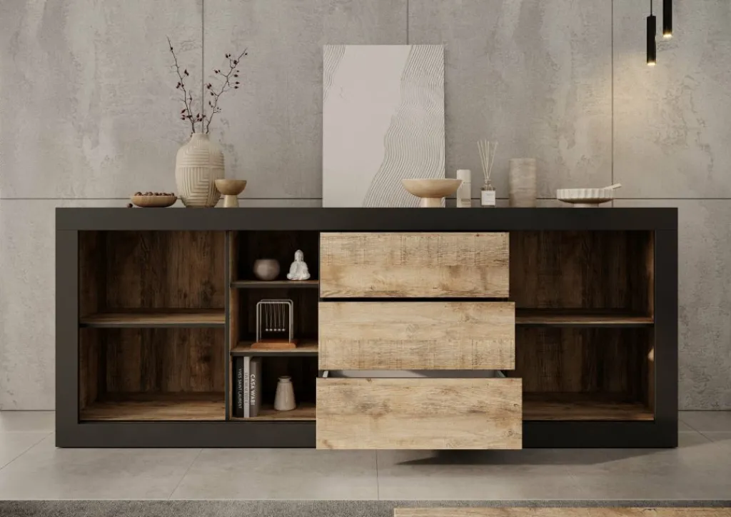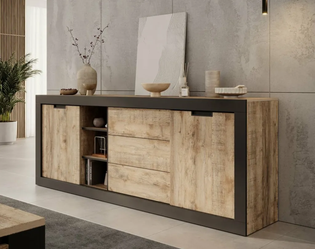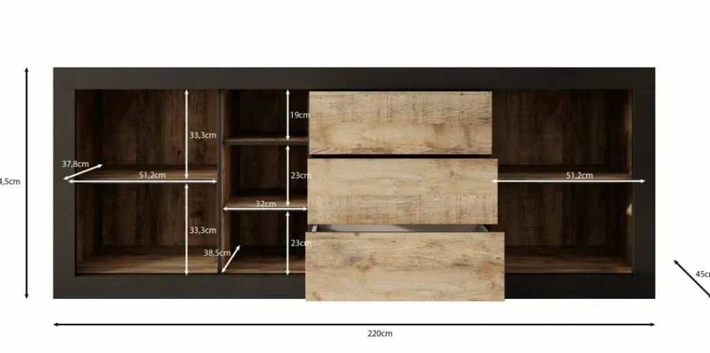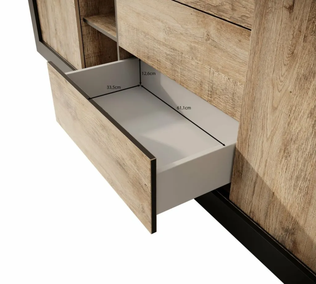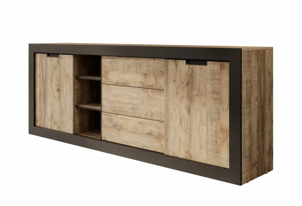 Dressoir Trinidad is een opbergkast in industriële stijl. De kast beschikt over 3 greeploze lades en 2 deuren. Deze deuren zijn schuifdeuren en hierachter zitten in totaal 4 opbergvakken. Ook heeft het meubel nog 3 open vakken. De Trinidad is uitgevoerd in een eiken met zwarte kleur.