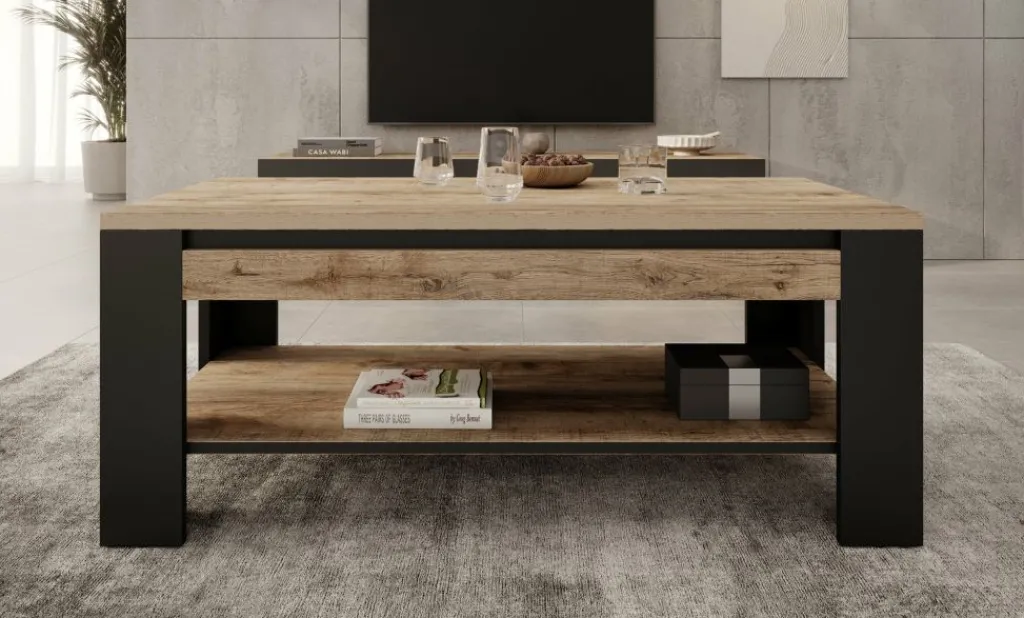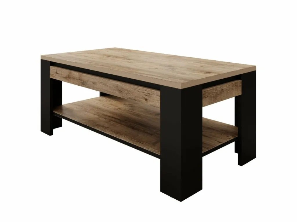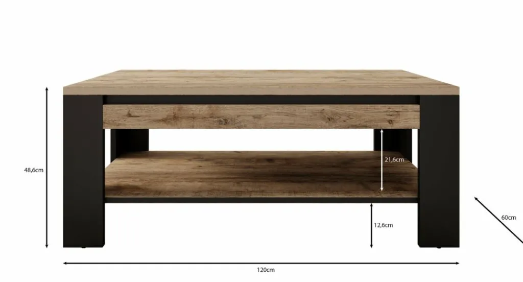 Salontafel Trinidad is een rechthoekige tafel gemaakt in een eiken kleur met zwart. Het model heeft een extra plank onder het blad om spullen kwijt te kunnen. Het meubel heeft een industriële uitstraling.