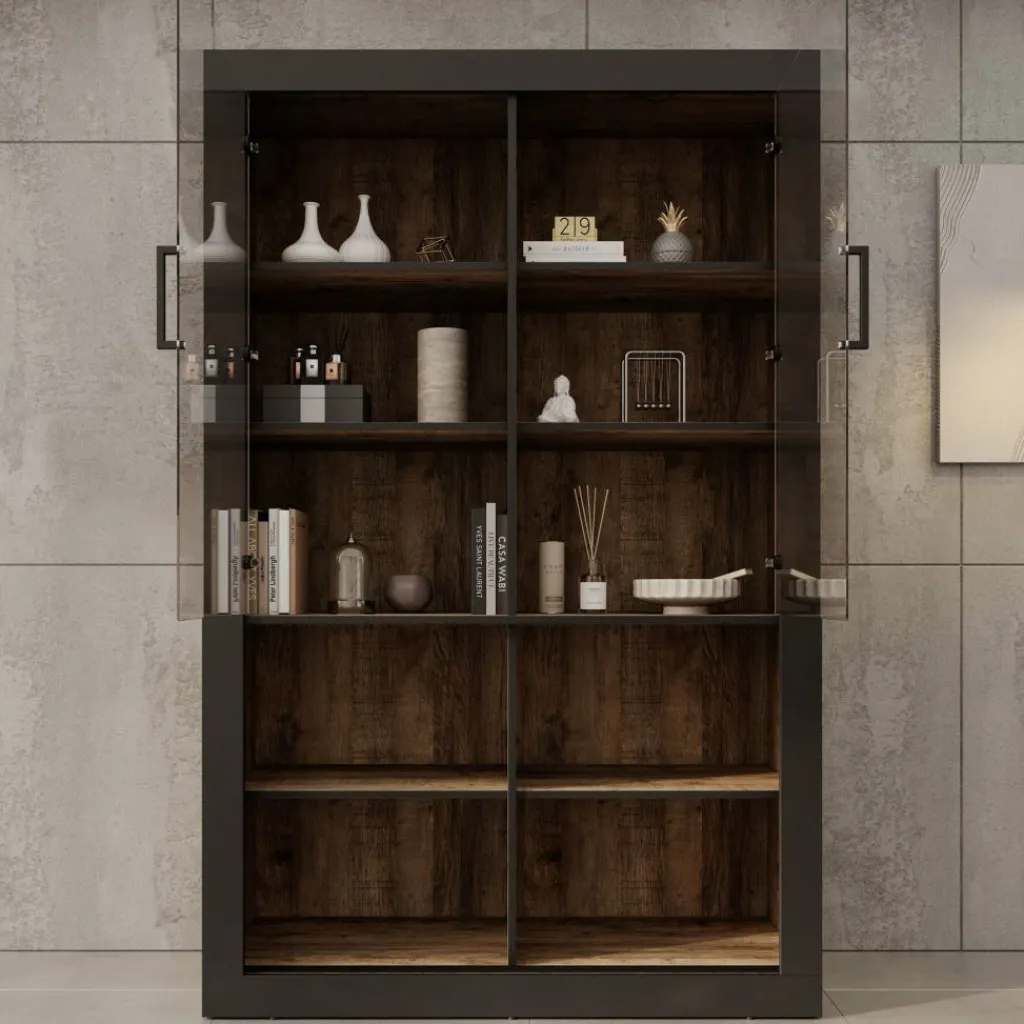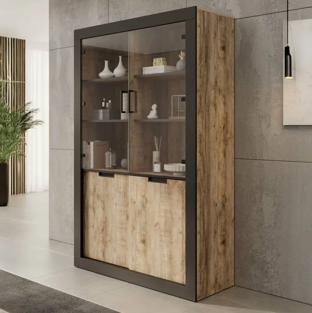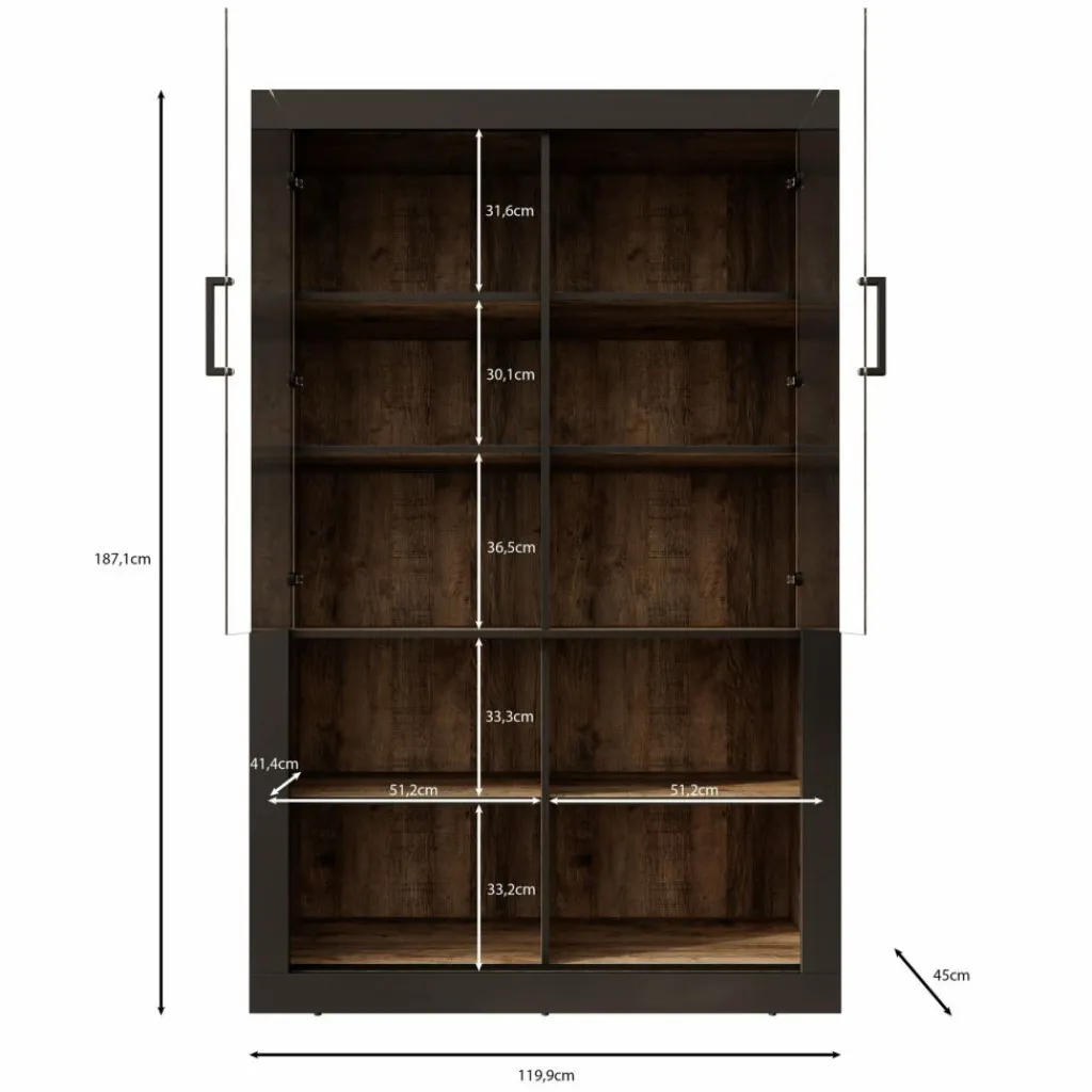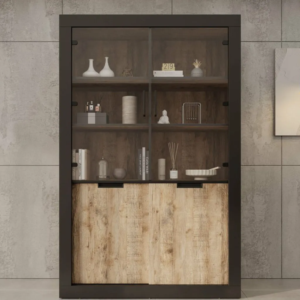 Buffetkast Trinidad is een praktisch vormgegeven kast in eiken kleur met zwart. De kast beschikt over 4 deuren. De onderste 2 deuren zijn schuifdeuren en de bovenste 2 deuren zijn scharnierdeuren die openen met zwarte handgrepen. Ook zijn deze 2 bovenste deuren volledig gemaakt van glas. In de binnenkant zijn 10 opbergvakken te vinden.