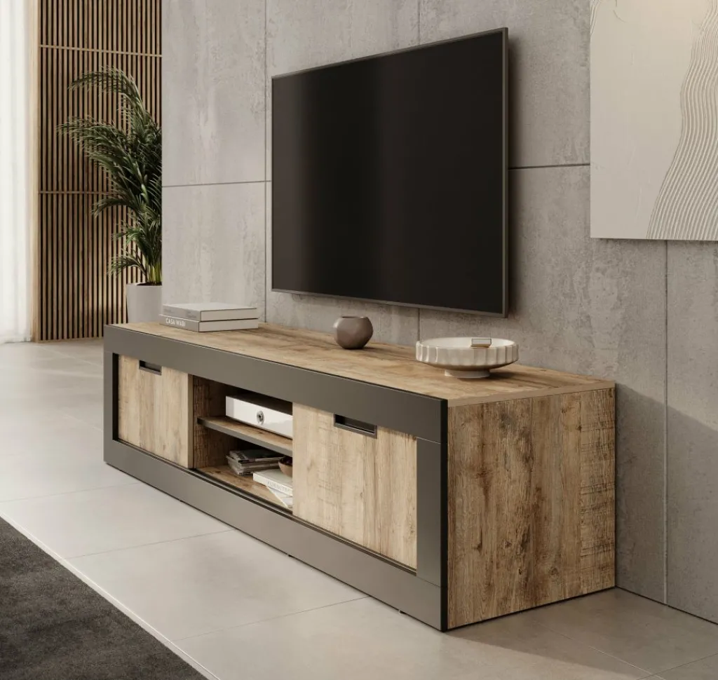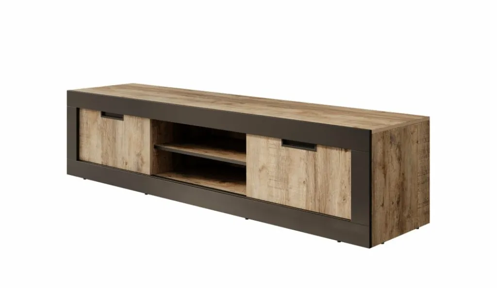 TV-Meubel Trinidad is een opbergkast voor onder de tv in een industriële stijl. De kast beschikt over 2 schuifdeuren die openen met zwarte handgrepen. Achter deze schuifdeuren zijn in totaal 2 opbergvakken te vinden. Ook heeft het meubel nog 2 open vakken. In de achterwand van deze open vakken zijn 2 uitsparingen te vinden op eventuele bedrading gemakkelijk te kunnen wegwerken. Het meubel is uitgevoerd in de kleur eiken met zwart.