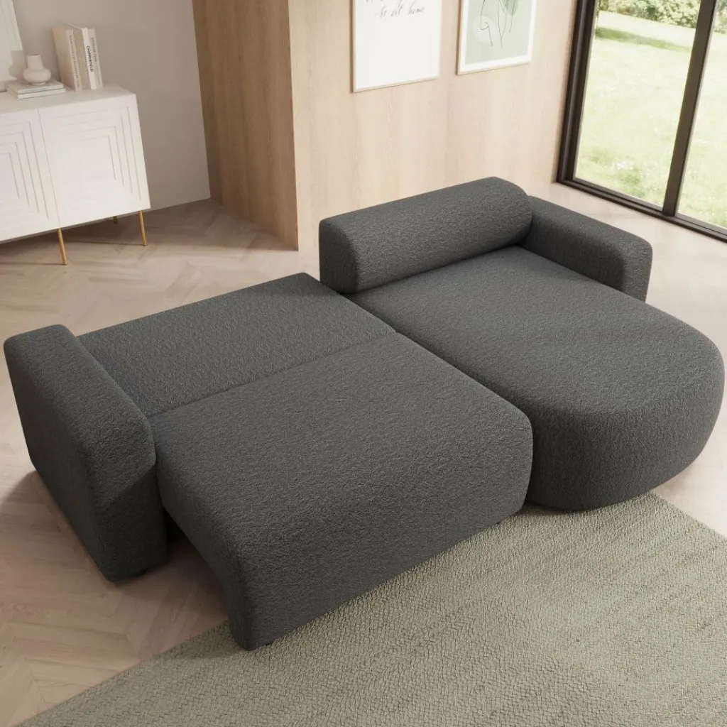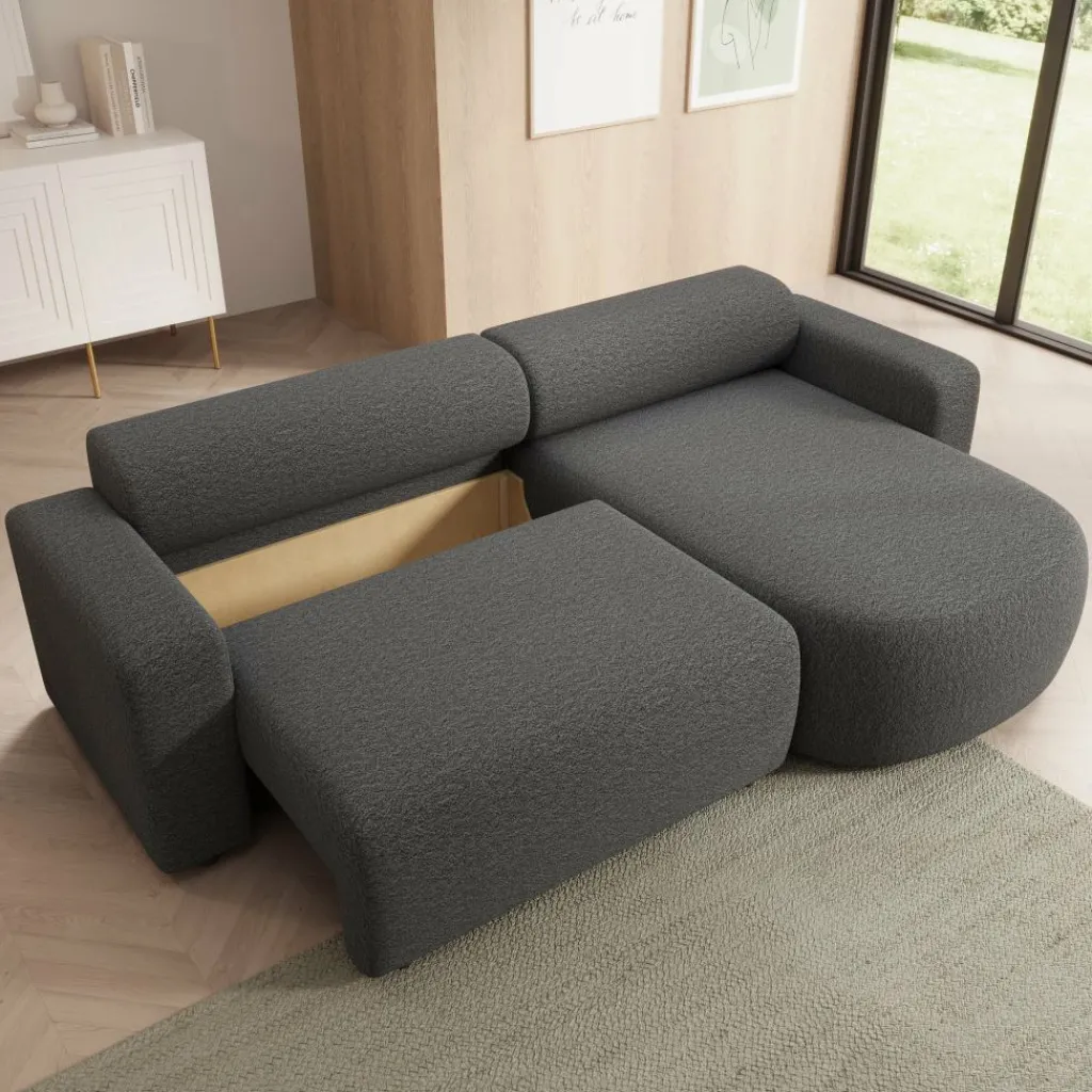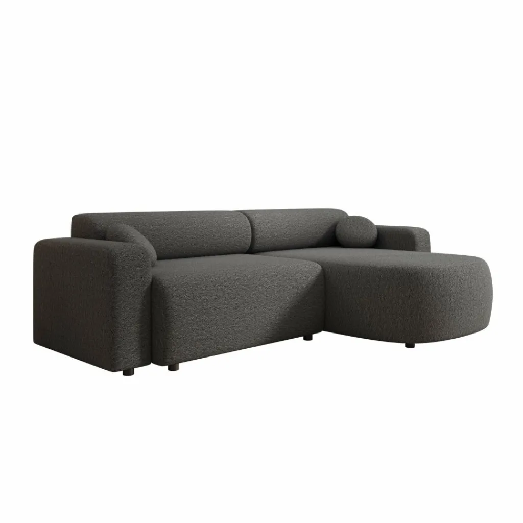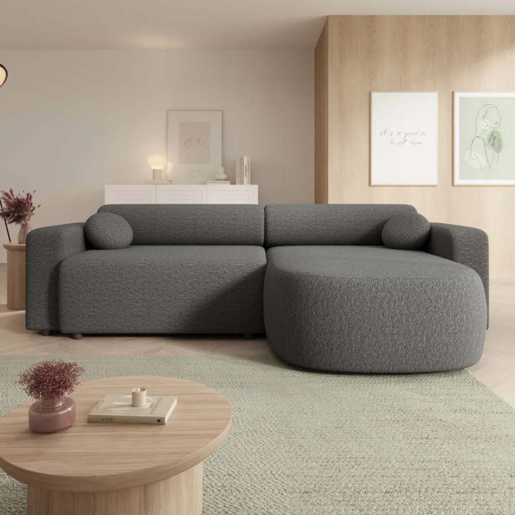 Tripp hoekbank is een stijlvolle 3-zitsbank met chaise longue, uitgevoerd in een zachte grijze stof. Het strakke ontwerp met afgeronde vormen geeft de bank een moderne en uitnodigende uitstraling. Dankzij de universele opstelling kan de chaise longue zowel links als rechts worden geplaatst, waardoor de bank flexibel aansluit bij jouw interieur.