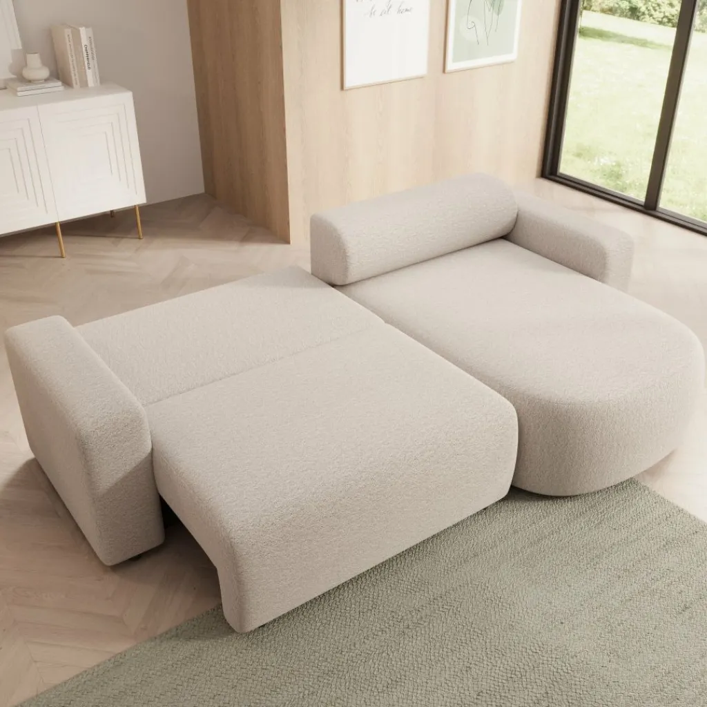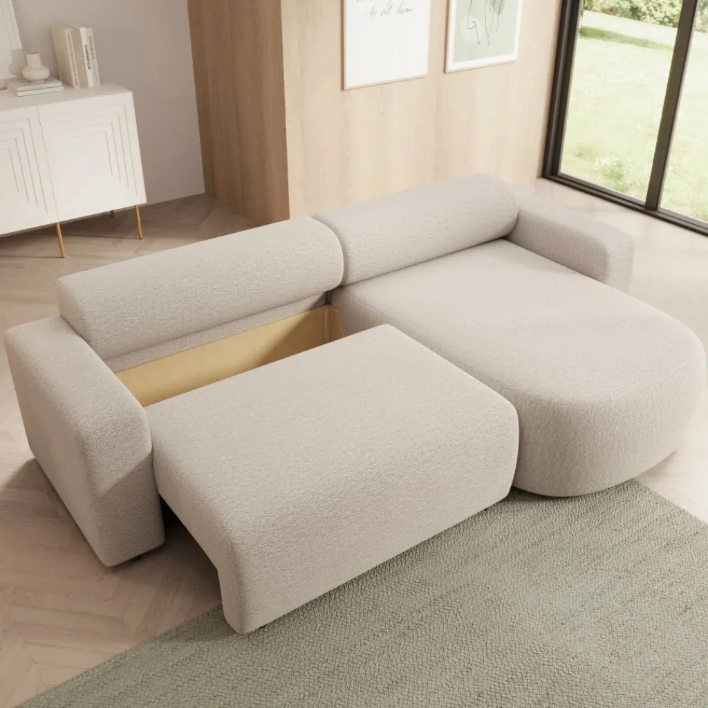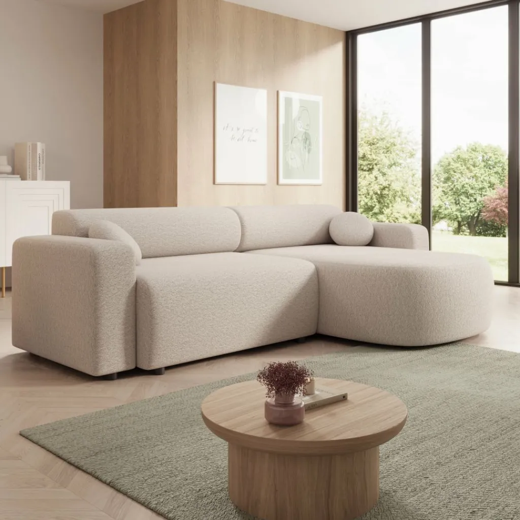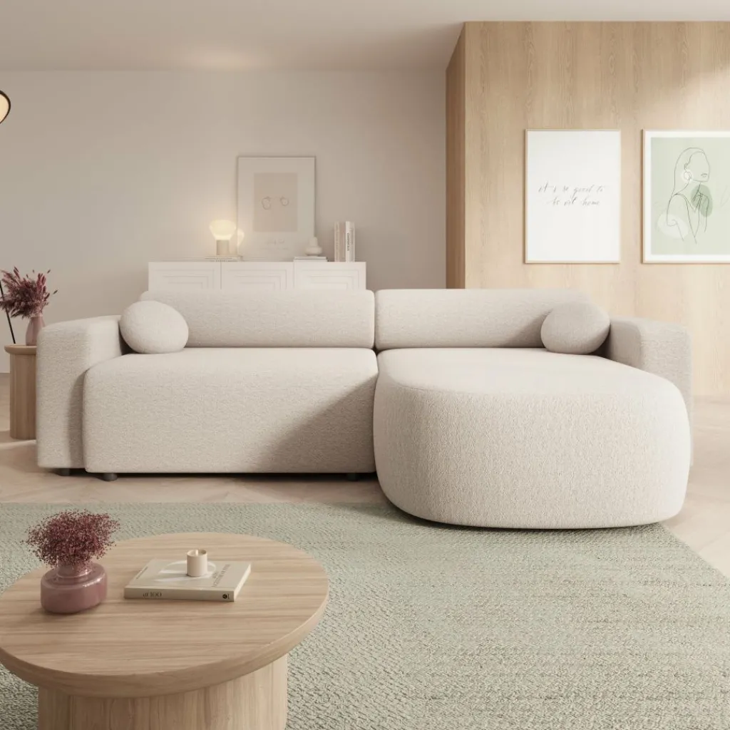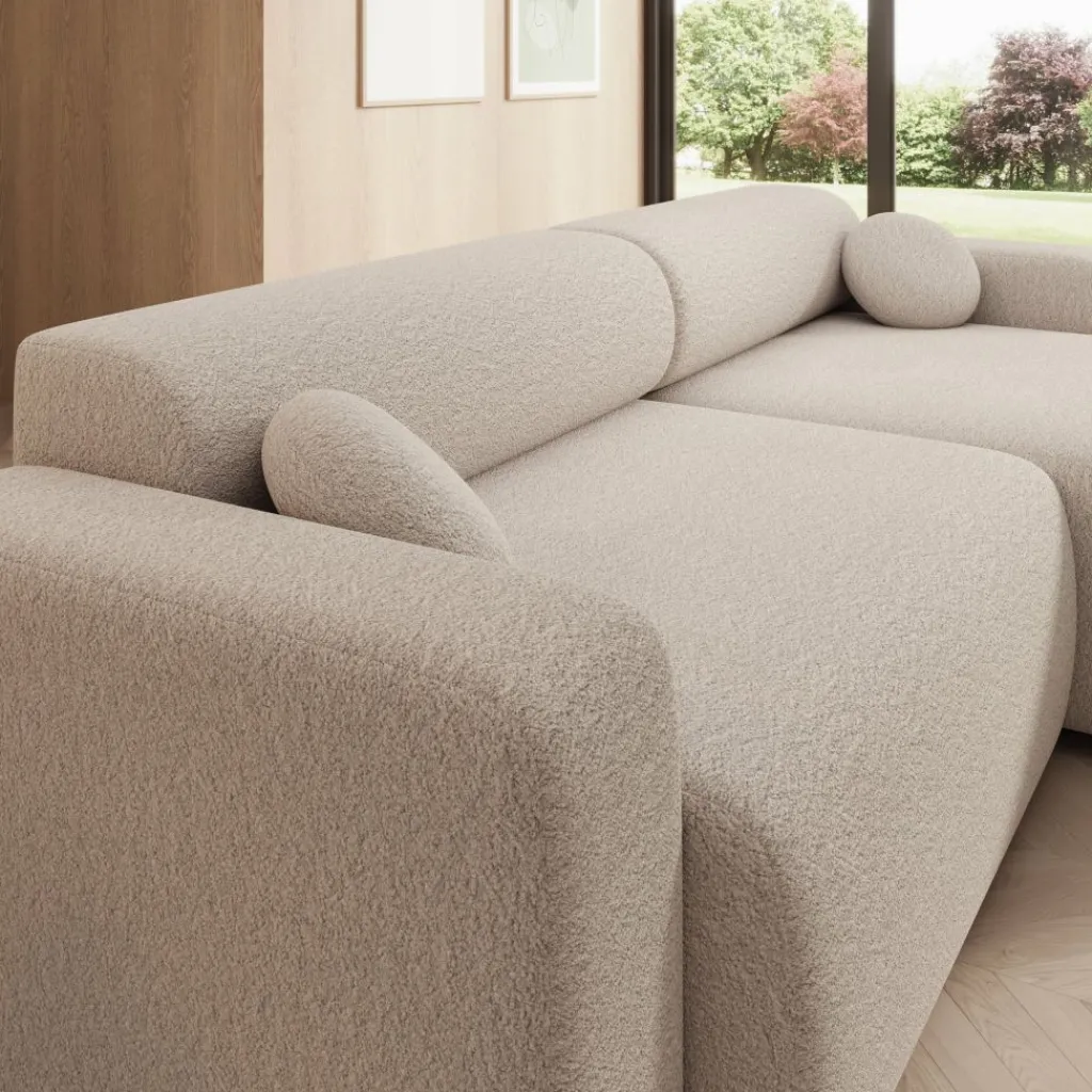 Tripp hoekbank is een elegante 3-zitsbank met chaise longue, uitgevoerd in een zachte beige stof. Het tijdloze ontwerp en de afgeronde vormen zorgen voor een moderne en uitnodigende uitstraling. Dankzij de universele opstelling kun je de chaise longue zowel links als rechts plaatsen, waardoor de bank zich moeiteloos aanpast aan jouw woonruimte.