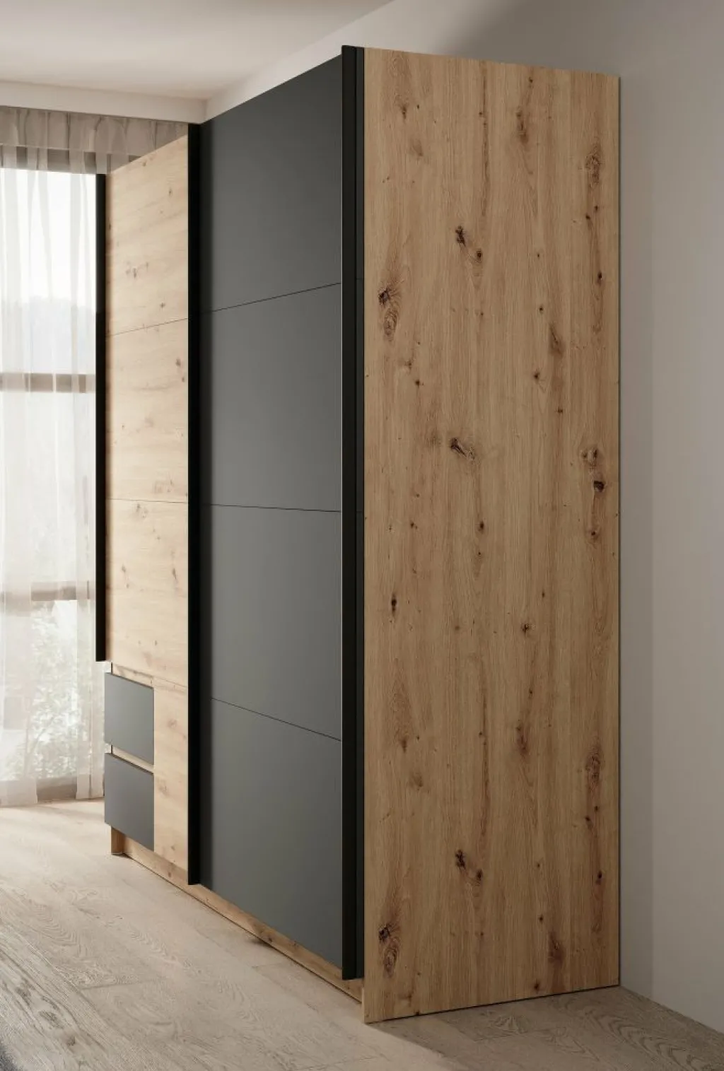 Kledingkast Ulan is een praktische garderobekast voor in je slaapkamer in eiken met grijze kleur. Dit model beschikt over 2 schuifdeuren en 2 lades. Deze deuren en lades zijn greeploos. De binnenkant van de Ulan is voorzien van 1 kledingroede en 6 opbergvakken, zodat je al je kleding netjes kunt opbergen en organiseren.