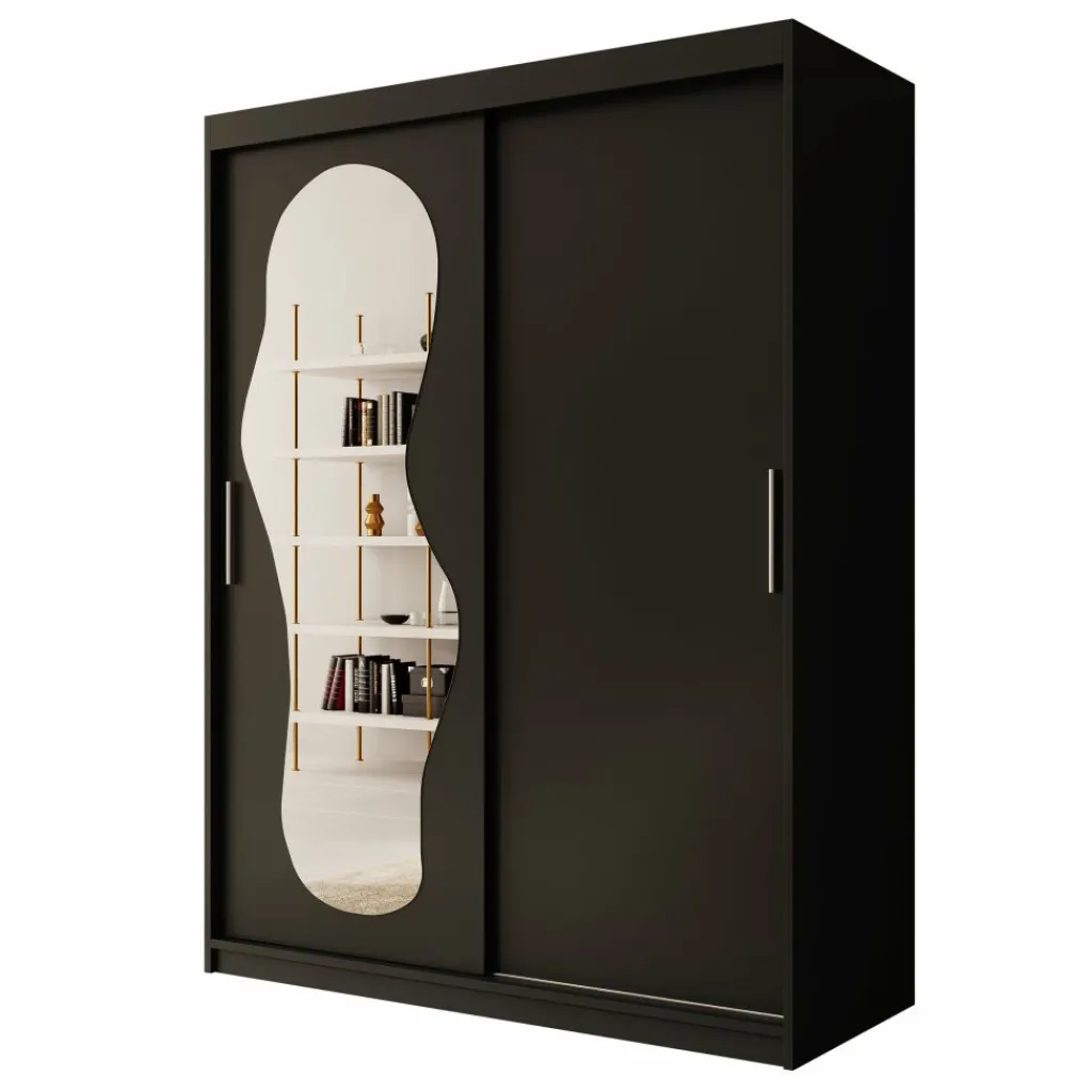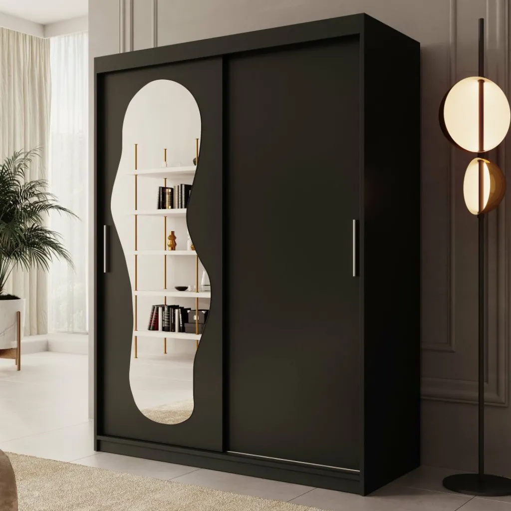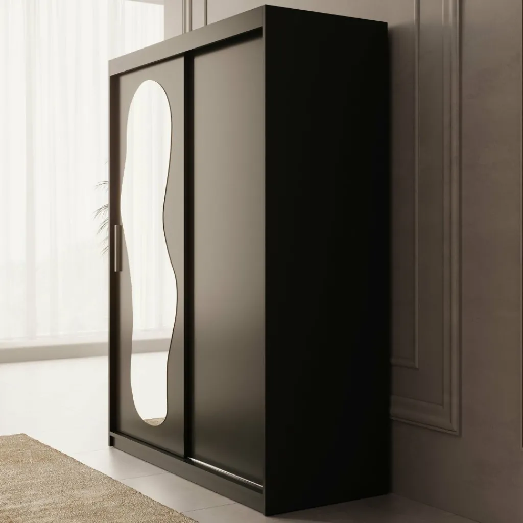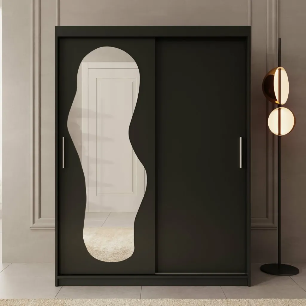 Kledingkast Ulysses combineert moderne vormgeving met een verrassend praktisch interieur. De twee schuifdeuren zijn ruimtebesparend én stijlvol, met als blikvanger een organisch gevormde spiegel die het ontwerp een speelse touch geeft. Achter de deuren vind je twee kledingroedes voor hangkleding en vijf overzichtelijke legvakken voor bijvoorbeeld stapels truien, beddengoed of opbergboxen.