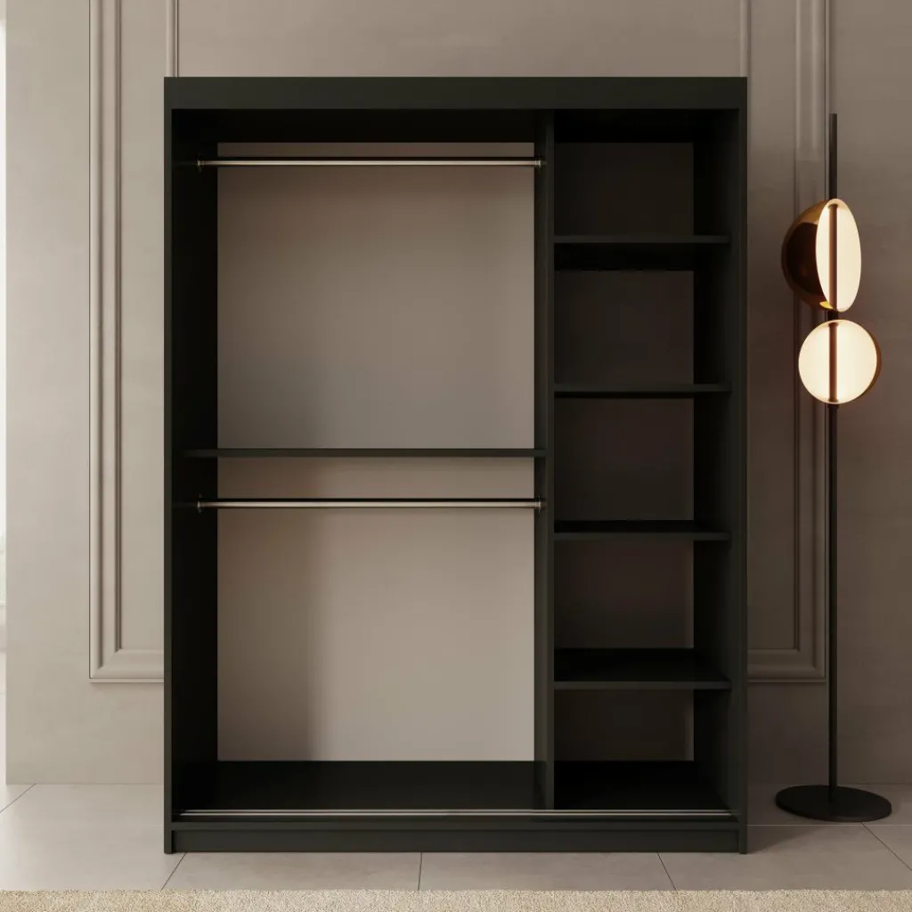 Dankzij de royale indeling blijft je garderobe overzichtelijk en snel toegankelijk. De kast is uitgevoerd in een diepzwarte kleur die makkelijk te combineren is in verschillende interieurstijlen.