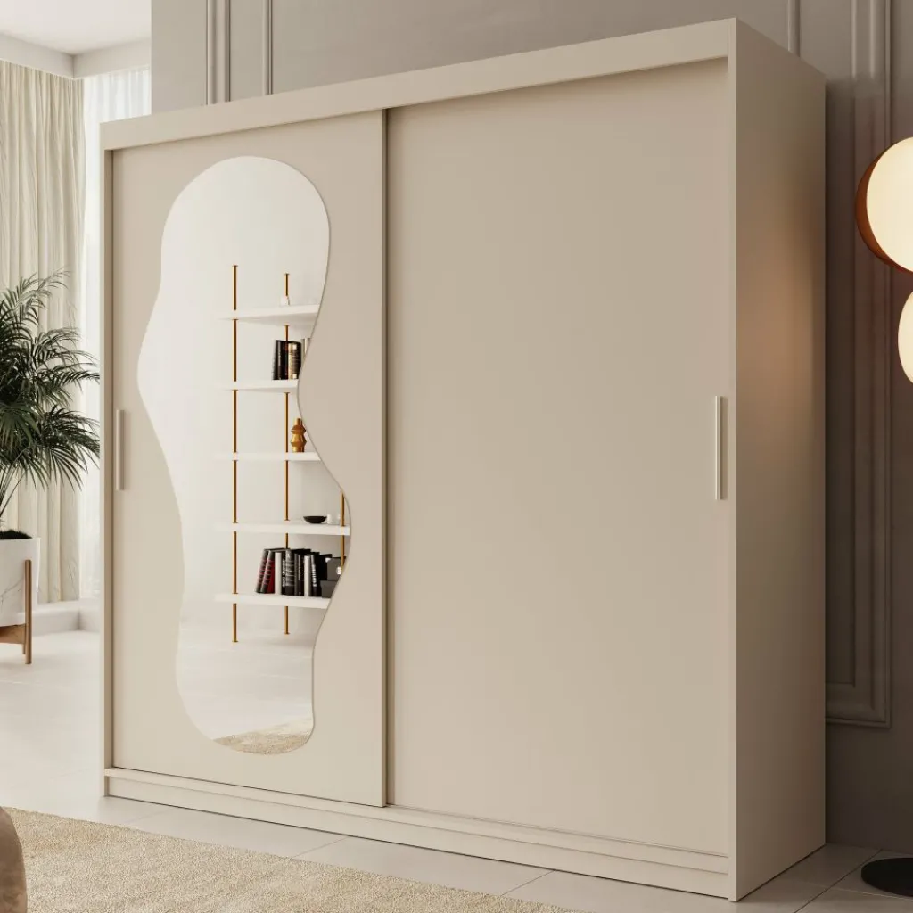 De Ulysses kledingkast van 200 cm combineert moderne eenvoud met een verrassend speelse touch. De beige afwerking straalt rust uit en laat zich moeiteloos combineren in uiteenlopende interieurstijlen. Wat meteen opvalt, is de sierlijk vormgegeven spiegel op de linkerdeur – een decoratief element dat niet alleen functioneel is, maar de kast ook een blikvanger maakt.