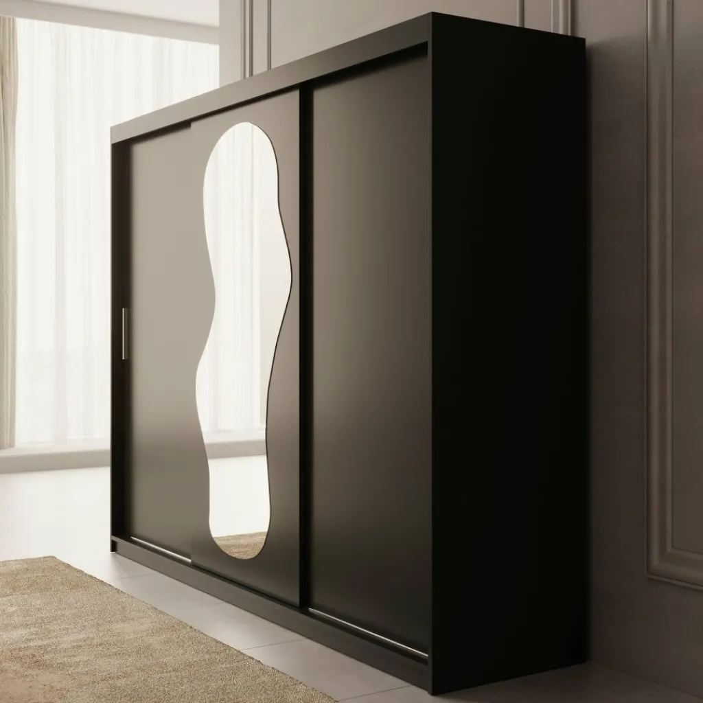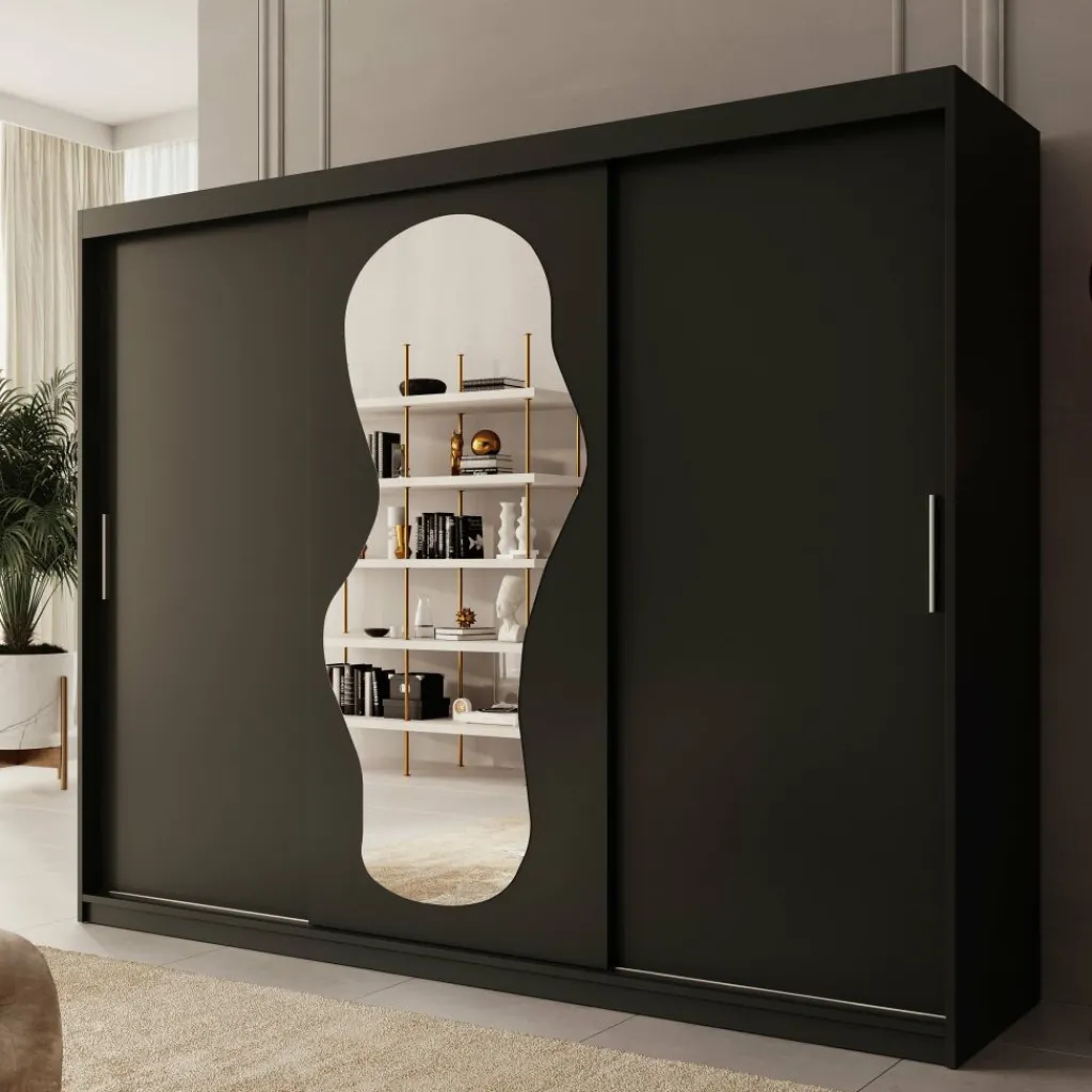 Met zijn strakke lijnen en diepzwarte kleur past de kledingkast Ulysses in elk interieur. De drie schuifdeuren openen soepel en zijn afgewerkt met subtiele zilverkleurige handgrepen. De middelste deur is voorzien van een organisch gevormde spiegel die niet alleen functioneel is, maar ook een stijlvolle blikvanger vormt. Achter de deuren vind je volop ruimte om kleding overzichtelijk op te bergen: twee brede kledingroedes voor hangkleding en tien open vakken voor bijvoorbeeld truien, jeans of beddengoed.