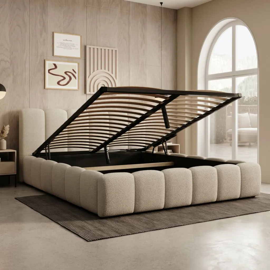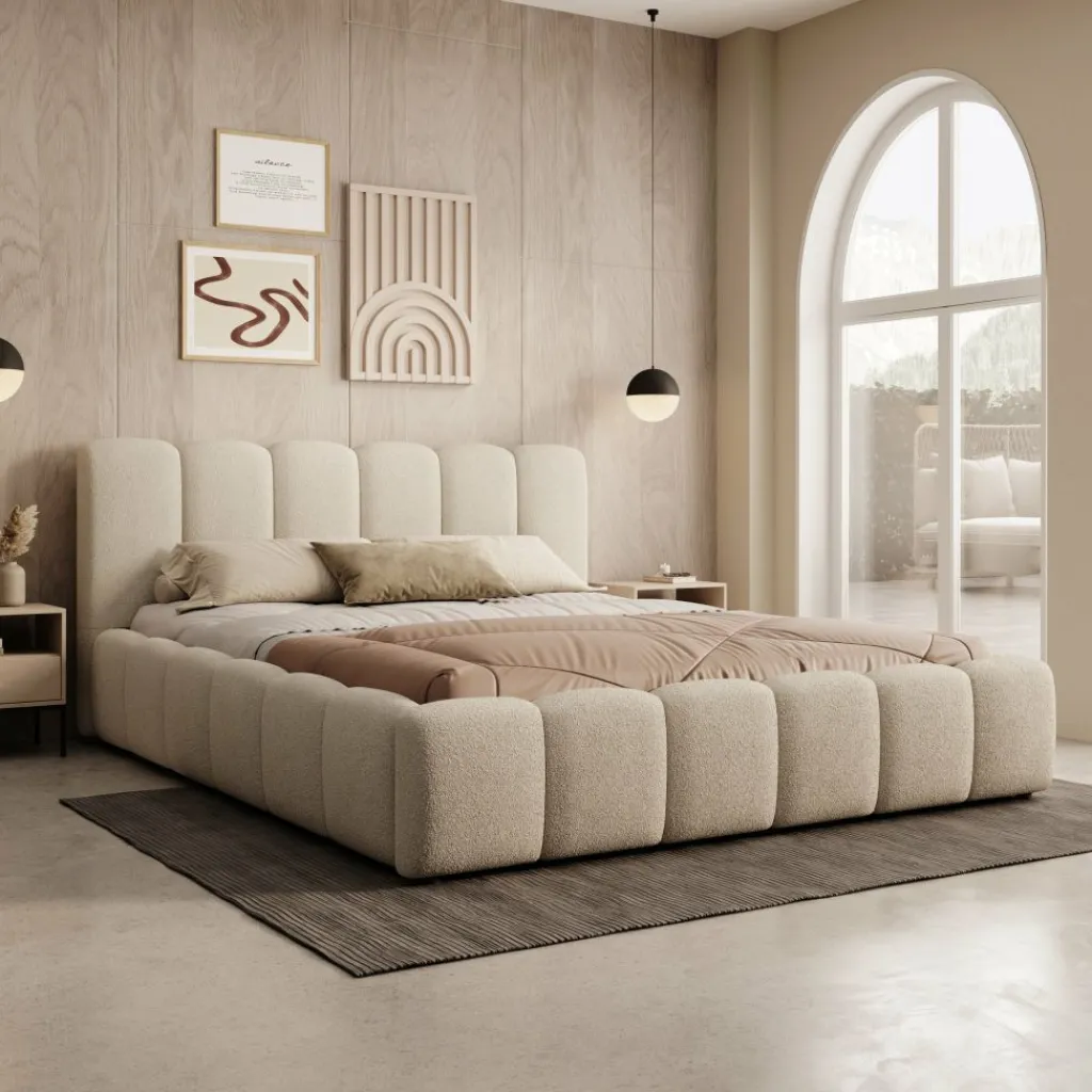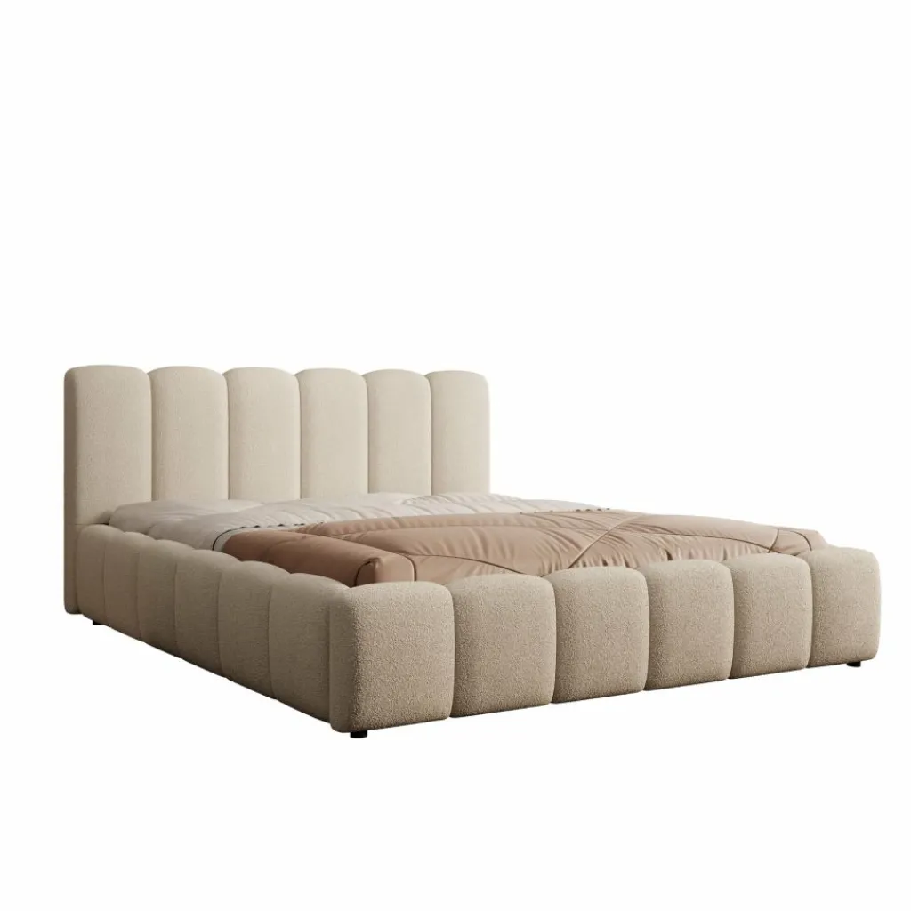 Het Valerio bed in beige teddystof heeft een blokvormige omlijsting en een hoog hoofdbord dat is opgebouwd uit verticale panelen. De teddystof heeft een volle structuur die het bed een gelijkmatige en rustige uitstraling geeft. Het frame is geschikt voor een matras van 160×200 cm en vormt een stabiele basis voor dagelijks gebruik.