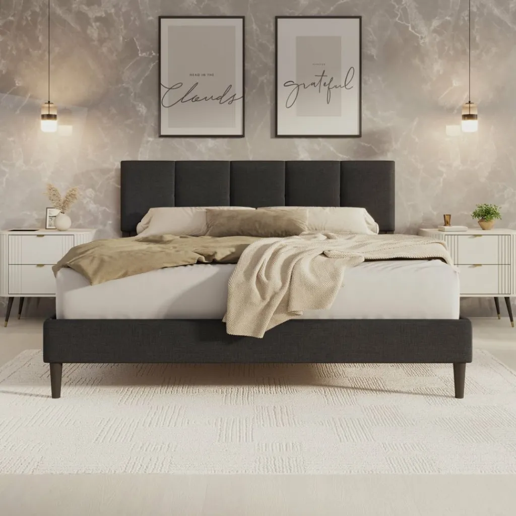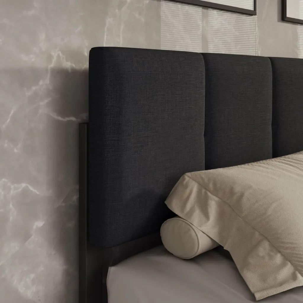 Het Varell bed in 180×200 cm biedt extra ruimte en behoudt dezelfde strakke vormgeving als de andere varianten. De zwarte stoffering zorgt voor een neutrale basis die eenvoudig te combineren is met verschillende interieurstijlen. Het hoofdbord is voorzien van verticale banen, wat het ontwerp een duidelijke en moderne uitstraling geeft.