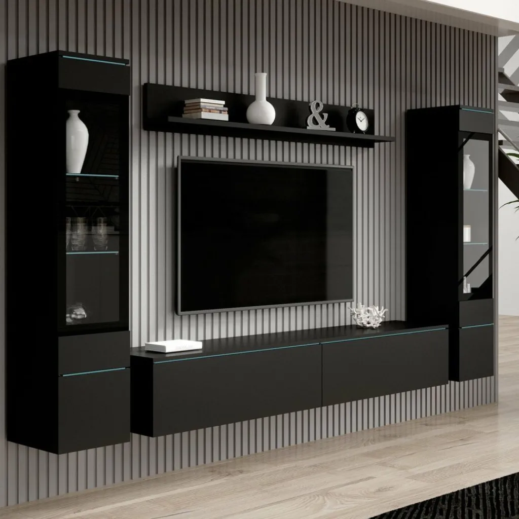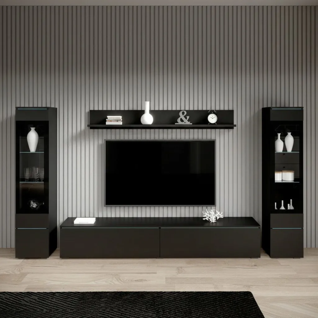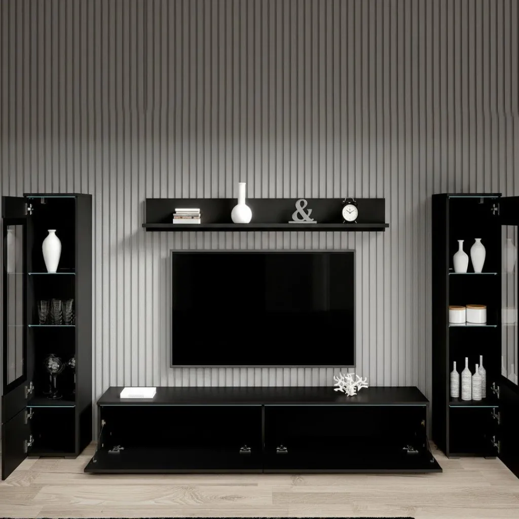 Wandmeubel Variety is een set van 4 meubels met ruime opbergmogelijkheden, uitgevoerd in spaanplaat met een imitatieprint (melamine coating) van mat zwart. De set bestaat uit een tv-meubel, 2 opbergkasten en wandplank. Deze meubels kunnen gezamenlijk in dezelfde ruimte geplaatst worden, maar natuurlijk ook individueel in verschillende ruimtes. Aan de bovenzijde van de kleppen en deurtjes zit een glasplaat verwerkt.