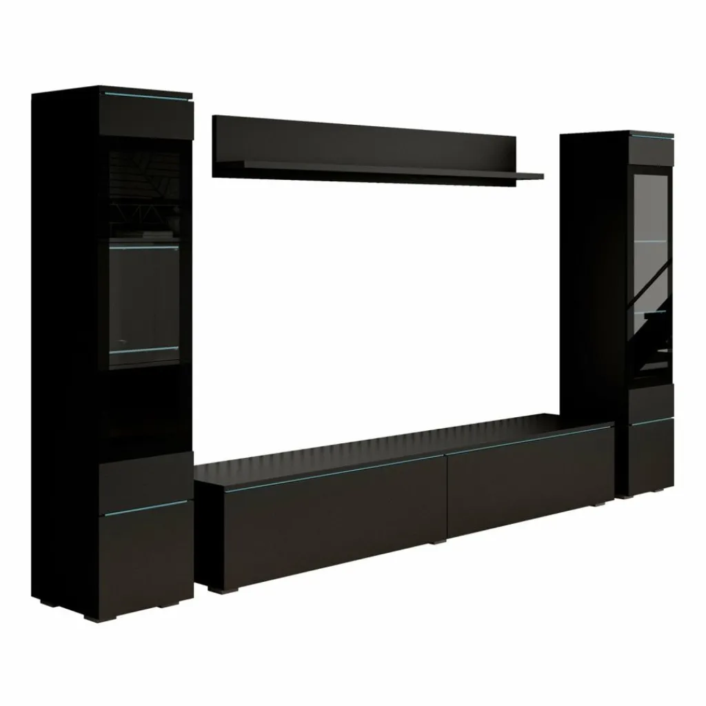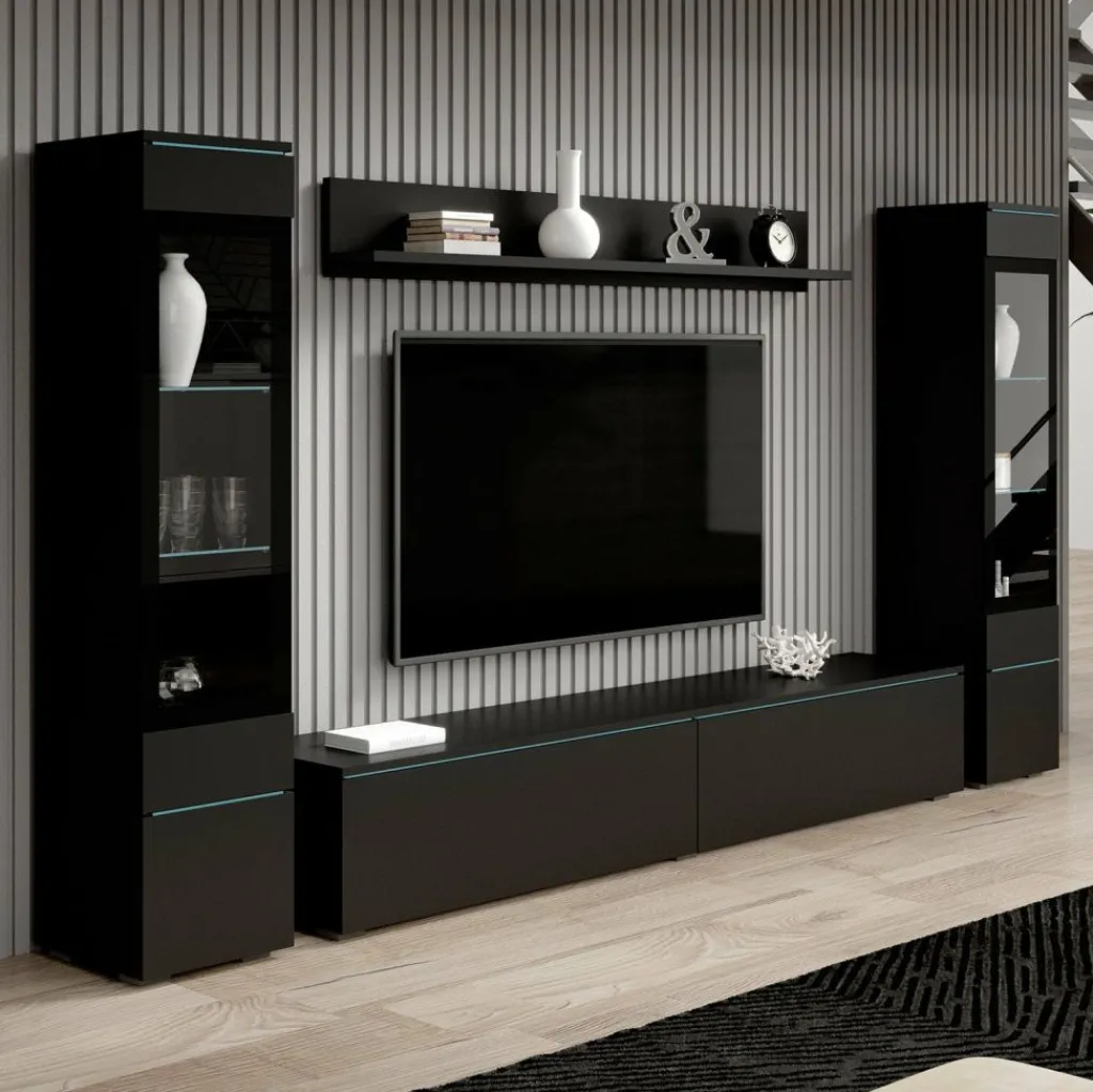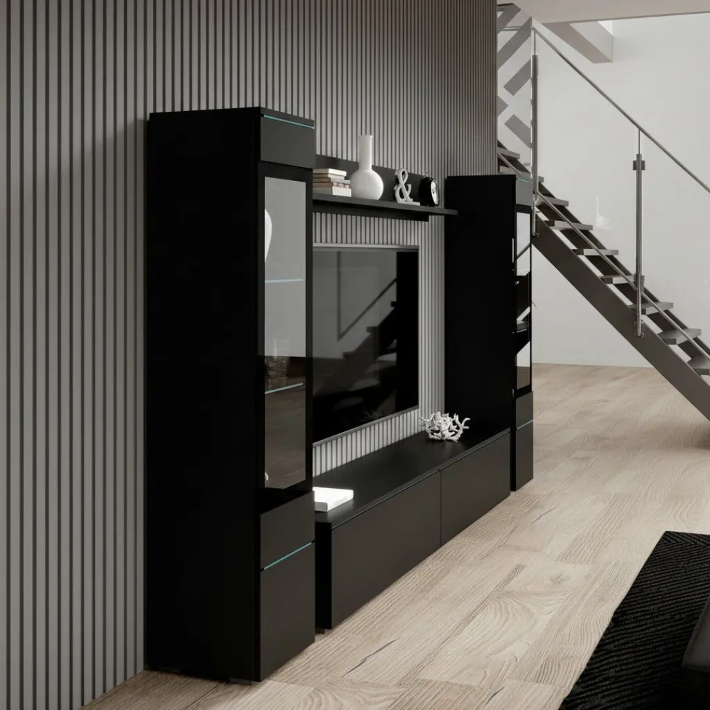 Wandmeubel Variety is een set van 4 meubels met ruime opbergmogelijkheden, uitgevoerd in spaanplaat met een imitatieprint (melamine coating) van mat zwart. De set bestaat uit een tv-meubel, 2 opbergkasten en wandplank. Deze meubels kunnen gezamenlijk in dezelfde ruimte geplaatst worden, maar natuurlijk ook individueel in verschillende ruimtes. Aan de bovenzijde van de kleppen en deurtjes zit een glasplaat verwerkt.