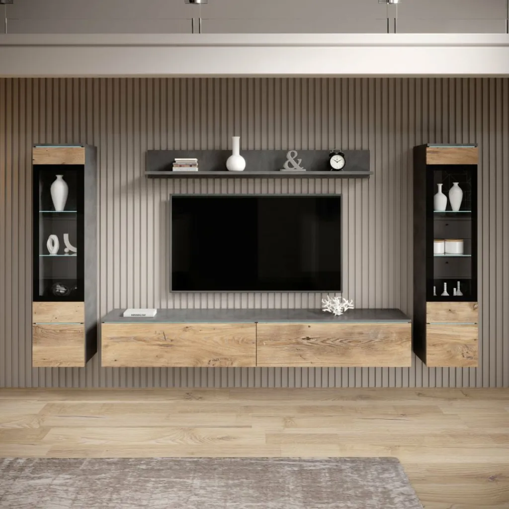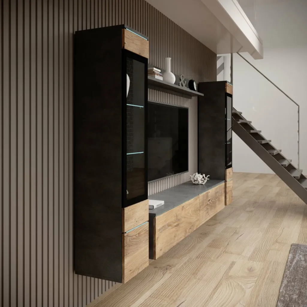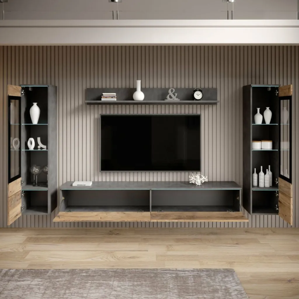 Het meubel bestaat uit meerdere delen, waaronder vitrinekasten met glazen planken, een tv-meubel en een wandplank. Dankzij de slimme indeling is er voldoende ruimte voor zowel decoratie als opberging. De combinatie van materialen en kleuren maakt dit wandmeubel een elegante toevoeging aan een modern of industrieel interieur.