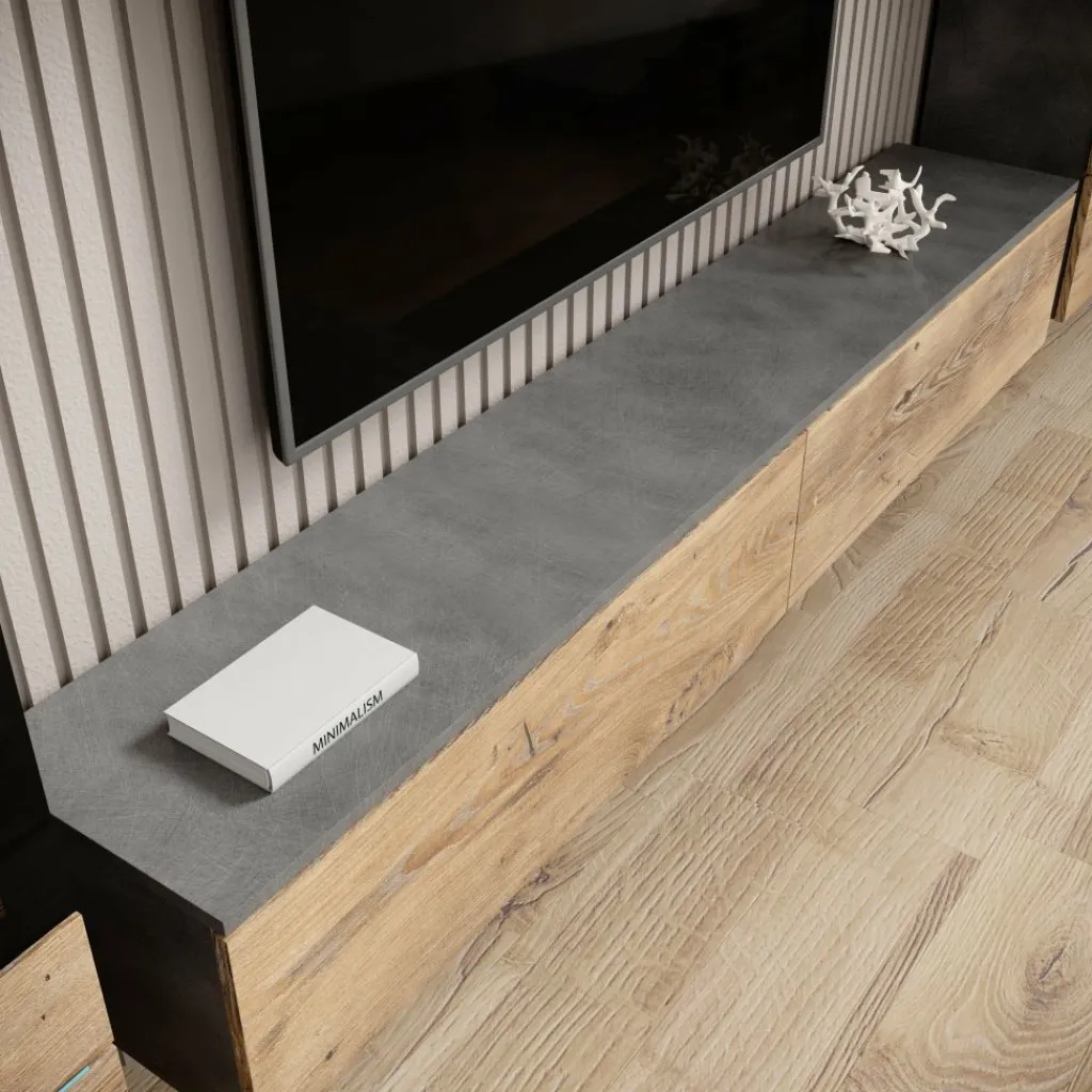 De Variety wandmeubel in eiken en grijs combineert warme houttinten met een moderne afwerking. De natuurlijke eikenlook contrasteert mooi met de strakke grijze elementen, wat zorgt voor een eigentijdse en stijlvolle uitstraling.