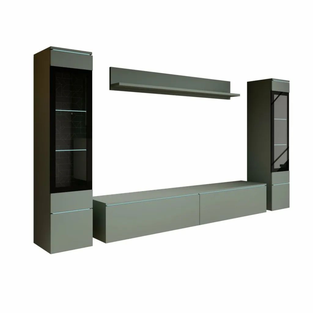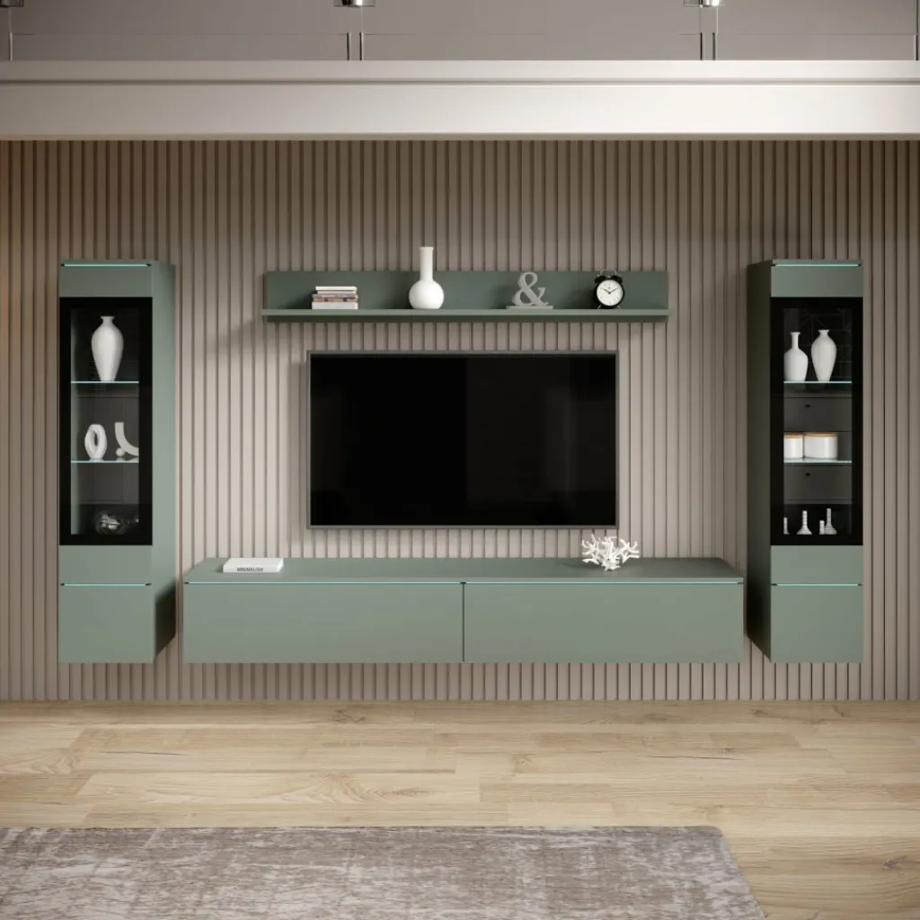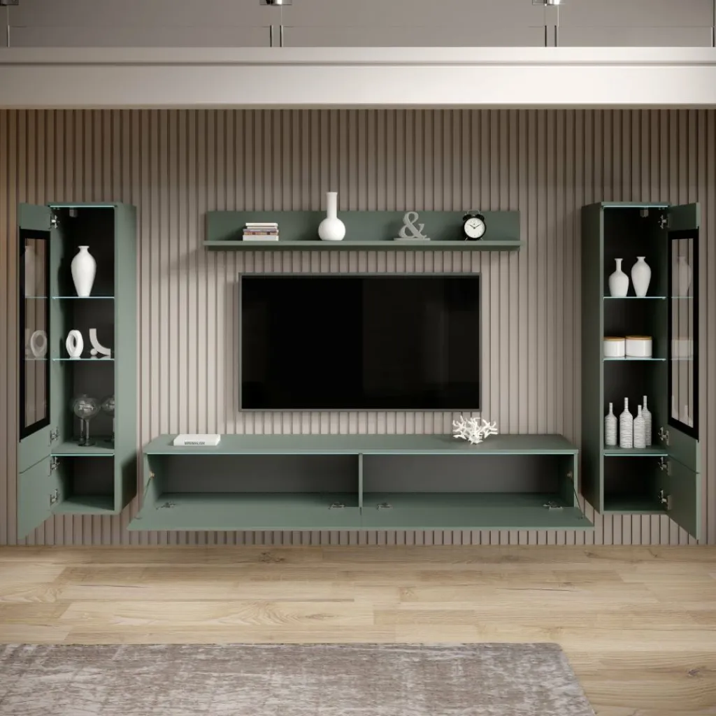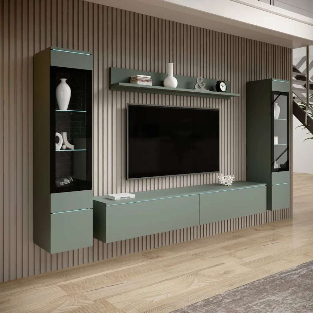 De set bestaat uit vitrinekasten met glazen planken, een tv-meubel en een wandplank. Dankzij de combinatie van open en gesloten opbergruimtes biedt het meubel voldoende plek voor decoratie, elektronica en accessoires. Een stijlvolle en functionele toevoeging aan elk modern interieur.