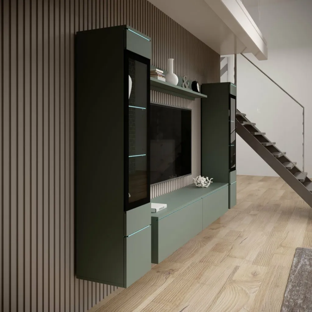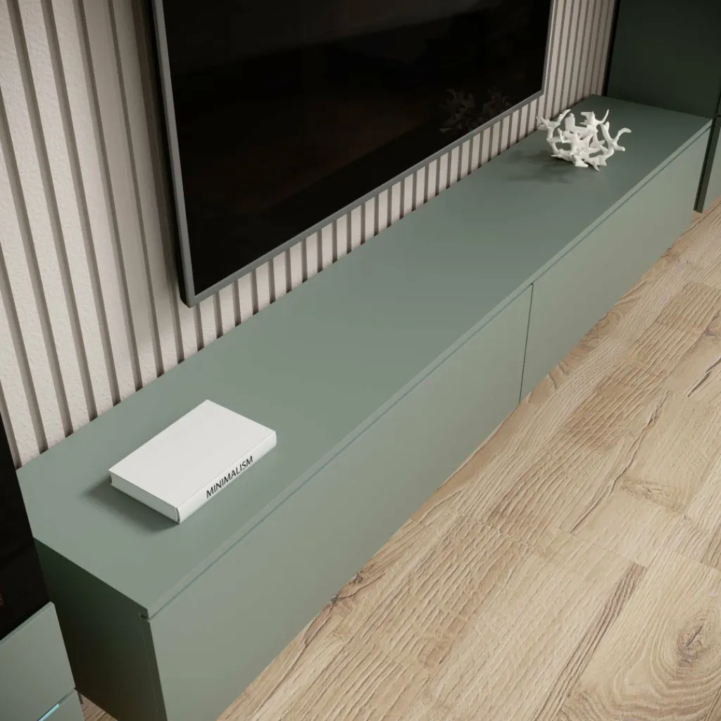 De Variety wandmeubel in groen heeft een frisse, moderne uitstraling die rust en karakter brengt in de woonkamer. De matte groene kleur geeft het meubel een eigentijds accent, terwijl de strakke lijnen zorgen voor een minimalistische look.