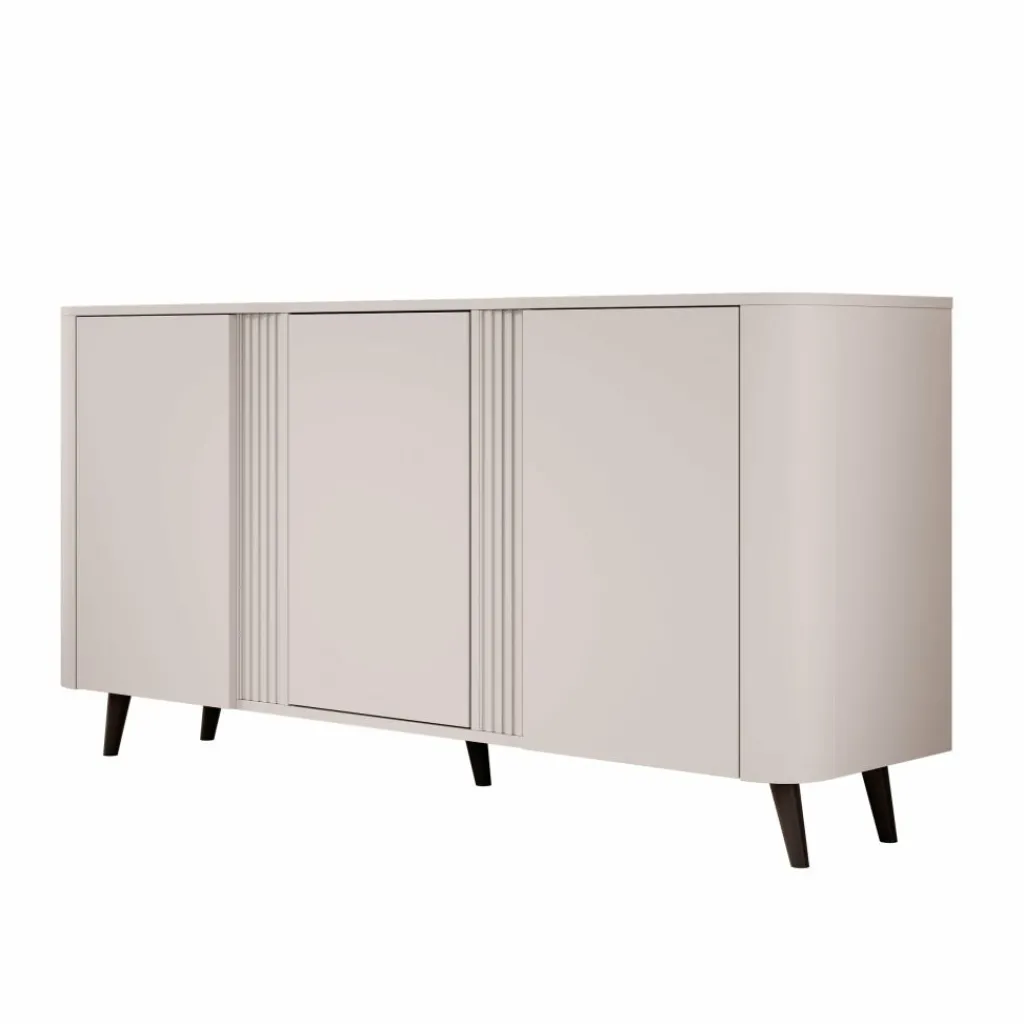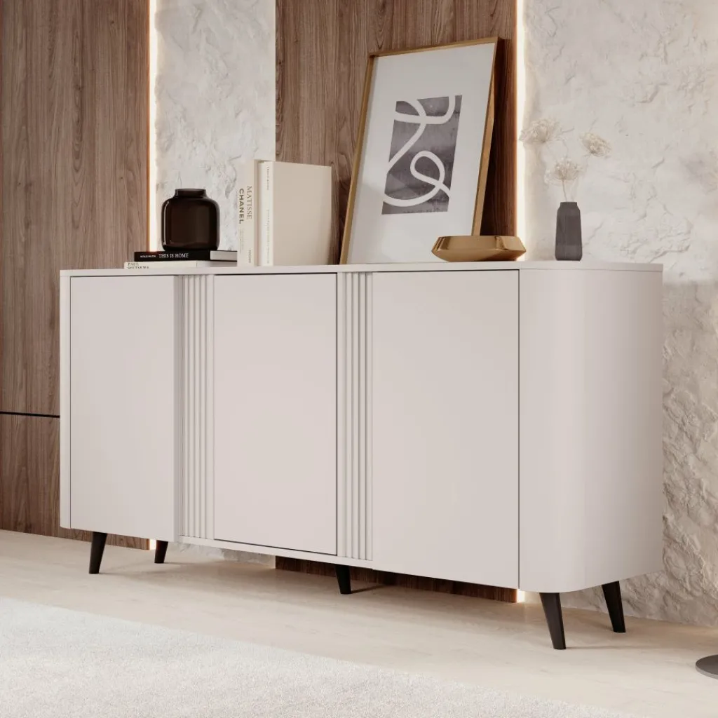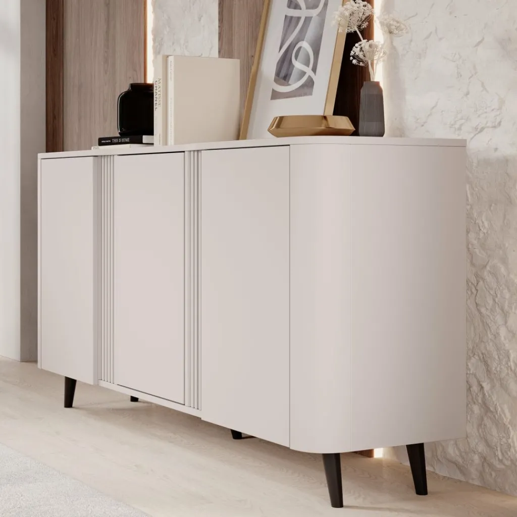 Het Veda dressoir in beige is een stijlvolle en praktische toevoeging aan ieder interieur. Dankzij de moderne vormgeving met strakke lijnen en subtiele details straalt het meubel rust en elegantie uit. De zachte beige kleur maakt het dressoir eenvoudig te combineren met diverse woonstijlen, van minimalistisch tot modern chic.