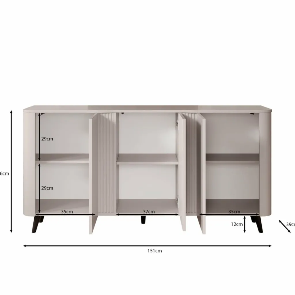 Met een breedte van 151 cm, een diepte van 39 cm en een hoogte van 76 cm biedt het dressoir volop opbergruimte. Achter de deuren bevinden zich meerdere vakken met legplanken, ideaal voor het netjes opbergen van servies, glaswerk, documenten of andere spullen. Zo blijft de woonkamer altijd georganiseerd en overzichtelijk.