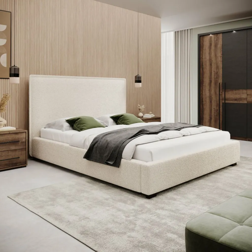 Met een afmeting van 160×200 cm biedt dit bed een ruim slaapoppervlak voor twee personen. Het stevige frame zorgt voor stabiliteit en duurzaamheid, terwijl het hoge hoofdbord een luxe accent toevoegt.