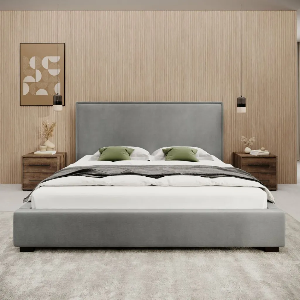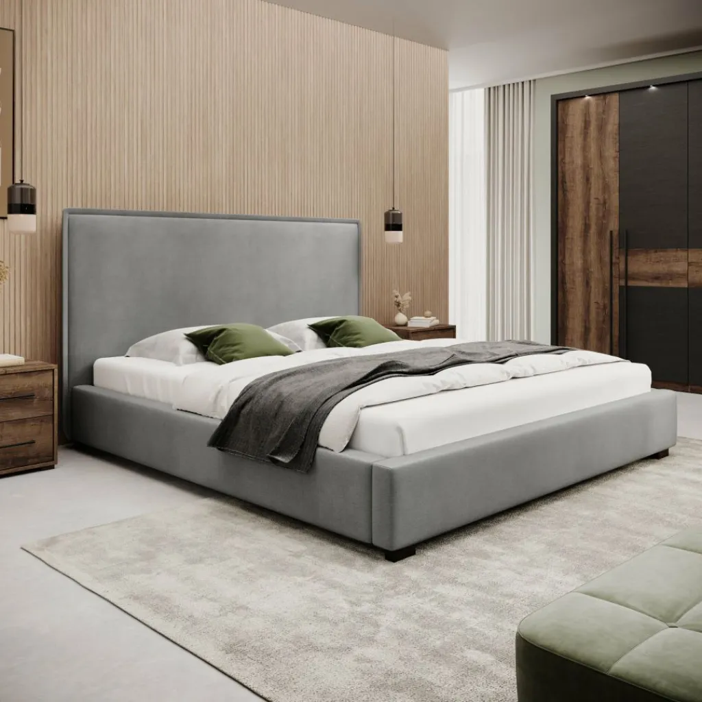 Het Veda tweepersoonsbed in velvet grijs brengt een luxe en eigentijdse sfeer in de slaapkamer. De fluweelzachte velvet stof in een stijlvolle grijze tint zorgt voor een moderne en elegante uitstraling, terwijl het hoge hoofdbord een verfijnd accent toevoegt en extra comfort biedt wanneer je rechtop in bed zit.