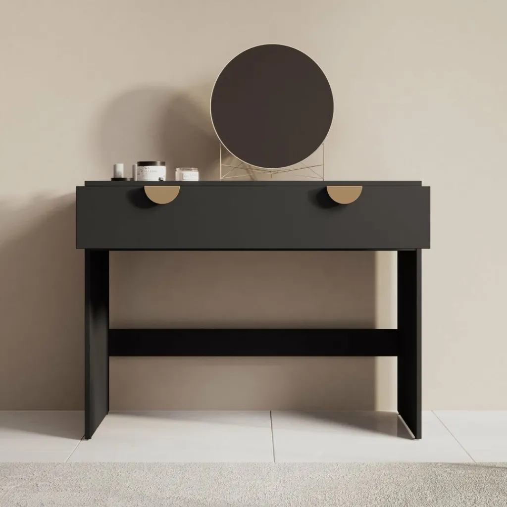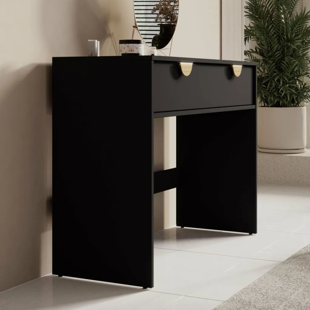 Kaptafel Veerle is een make-up tafel in modern, hotel chique stijl. De kaptafel beschikt over 2 lades die openen met goudkleurige handgrepen. De rest van het meubel is afgewerkt in een mat zwarte kleur.