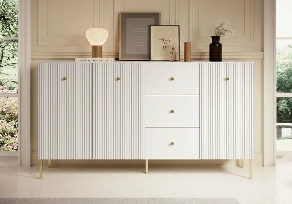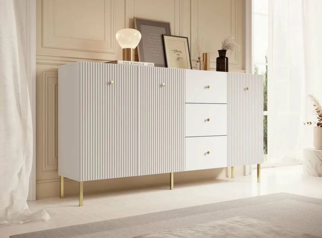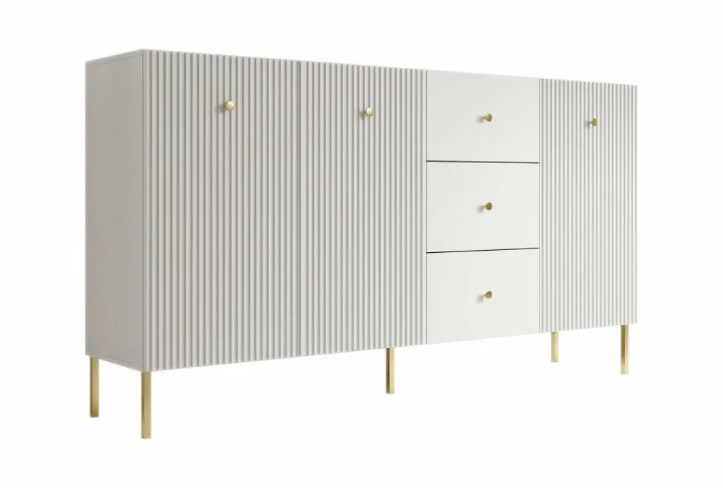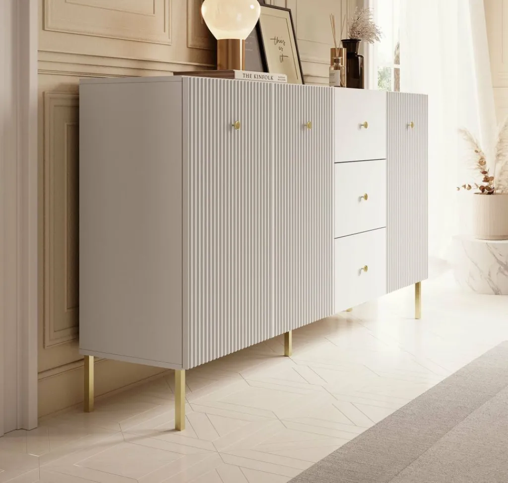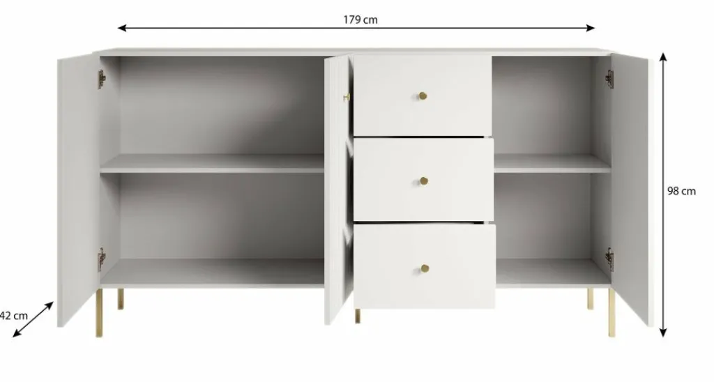 De kast heeft 3 deuren en 3 lades. Deze openen via goudkleurige knoppen. Achter de deuren zitten 4 opbergvakken. Op de voorkant van de deuren zitten latten.