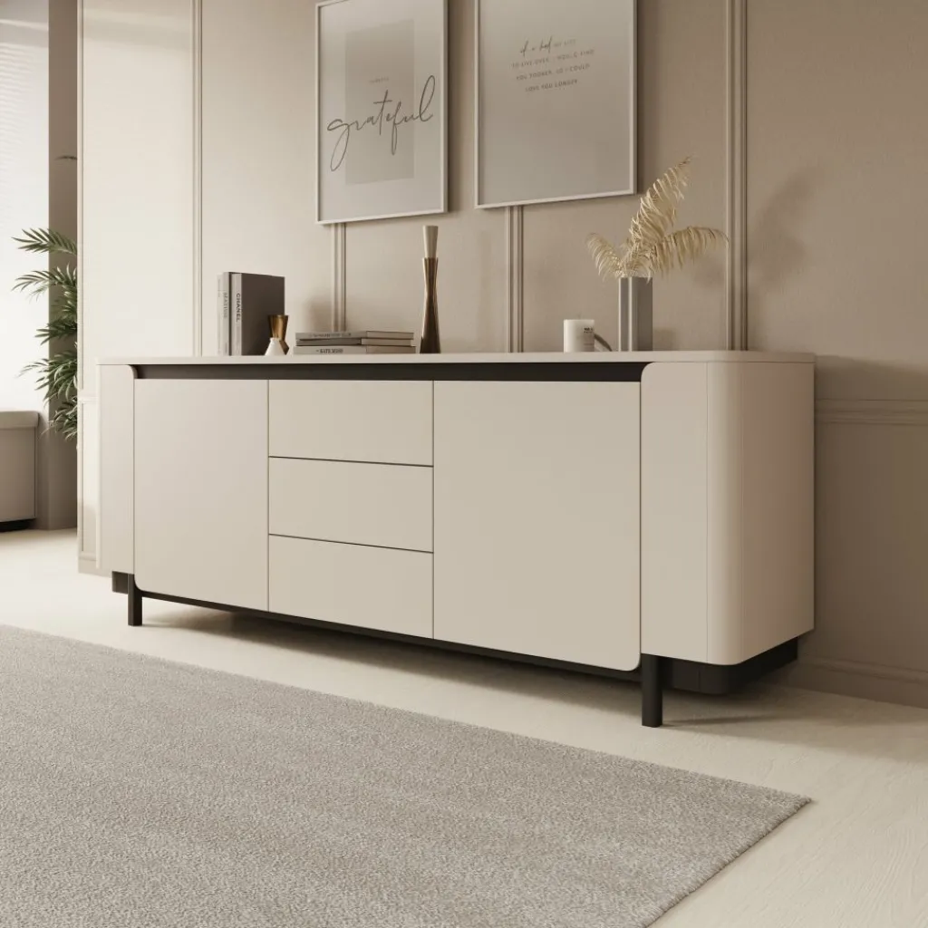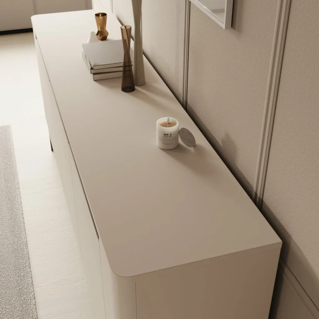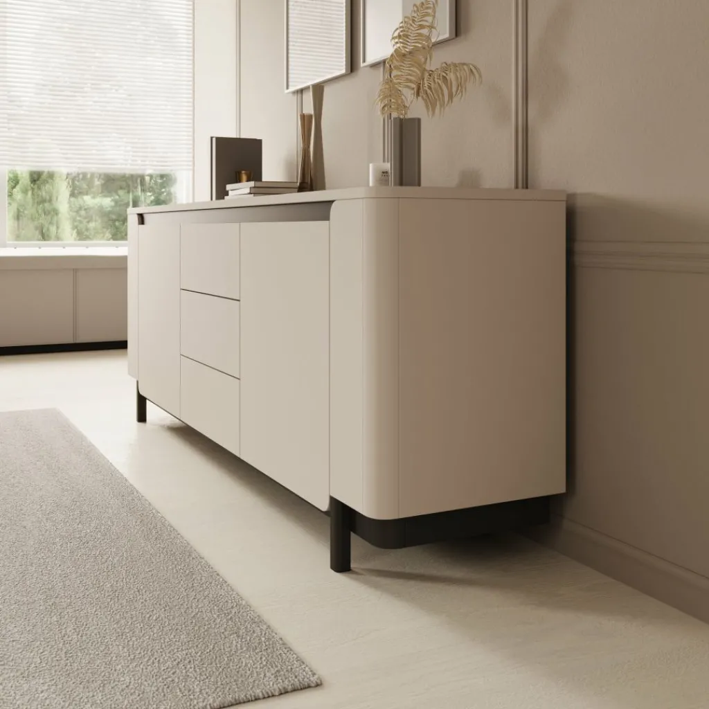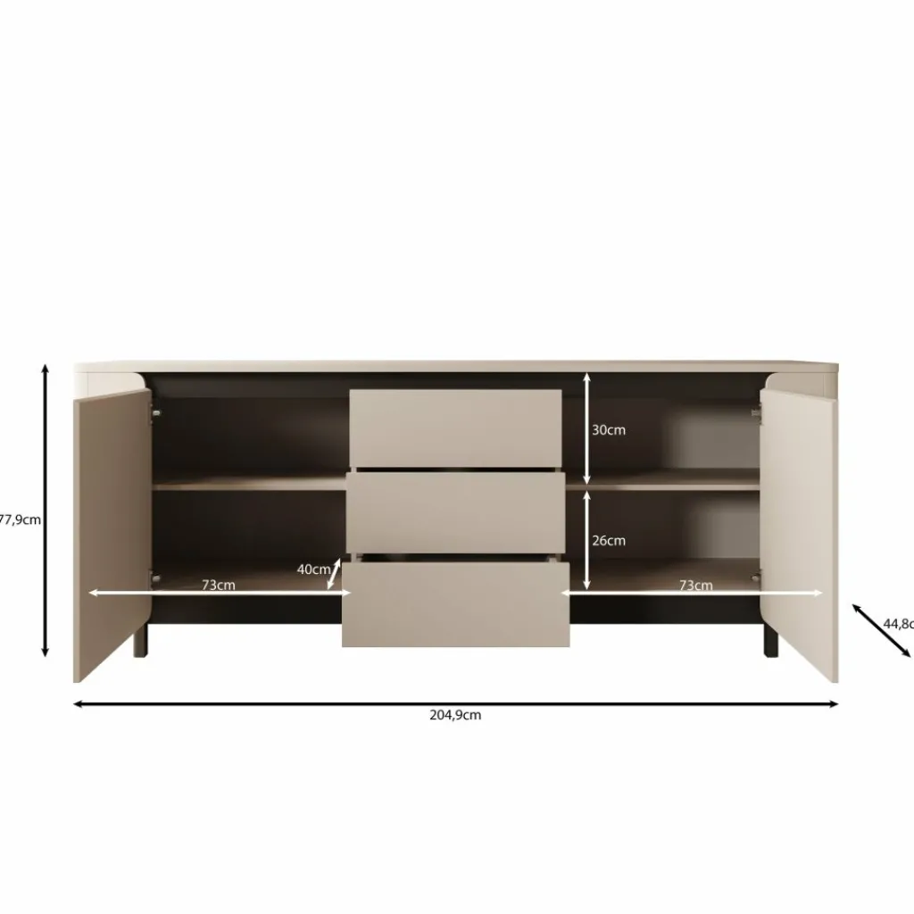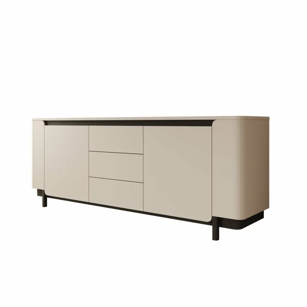 Dit Vexon dressoir is uitgevoerd in beige met zwarte accenten en heeft een breed, laag ontwerp met afgeronde hoeken. De kast staat op slanke zwarte poten en heeft een totale afmeting van 205 cm breed, 45 cm diep en 78 cm hoog. Door het lage profiel is het meubel geschikt voor plaatsing in de woonkamer, eetkamer of hal.