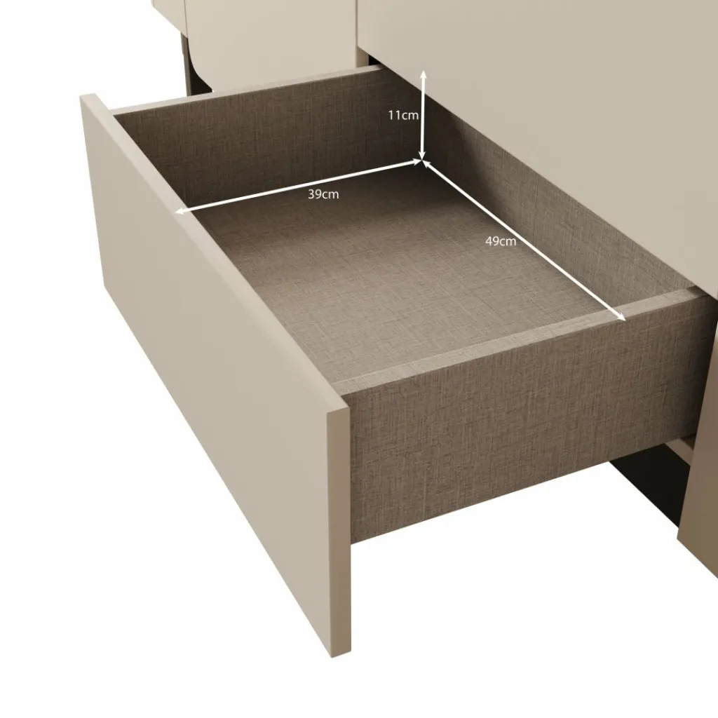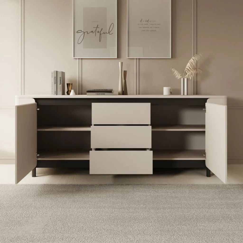 De indeling bestaat uit twee gesloten kastvakken aan de linker- en rechterzijde en drie lades in het midden. Achter de deuren bevindt zich per zijde een legplank, waardoor de opbergruimte overzichtelijk verdeeld is. De lades bieden extra ruimte voor kleinere spullen zoals servies, documenten of accessoires. Alle fronten zijn greeploos uitgevoerd.